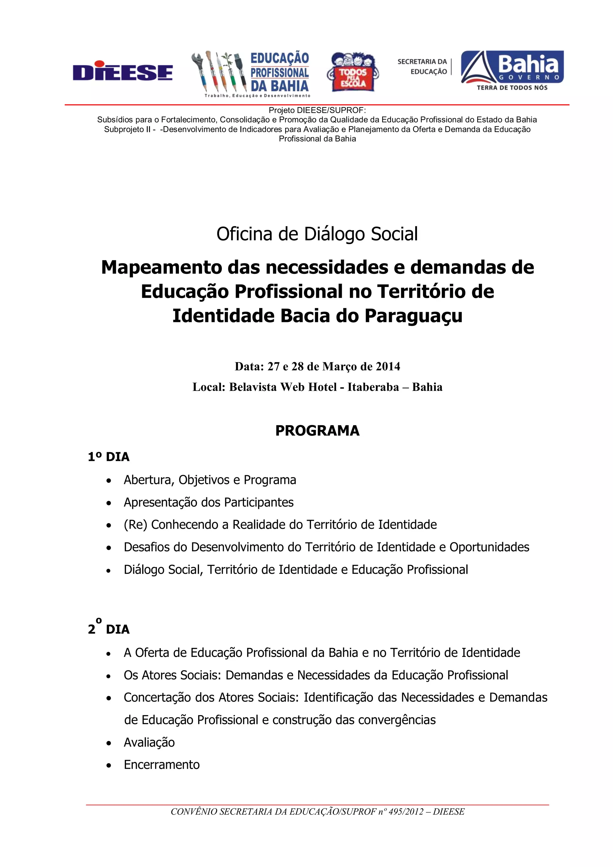 O documento descreve o programa de uma oficina de diálogo social realizada em março de 2014 para mapear as necessidades e demandas de educação profissional na Bacia do Paraguaçu, Bahia. O programa incluiu apresentações sobre a realidade do território, desafios de desenvolvimento e educação profissional, além de discussões entre atores sociais para identificar demandas.