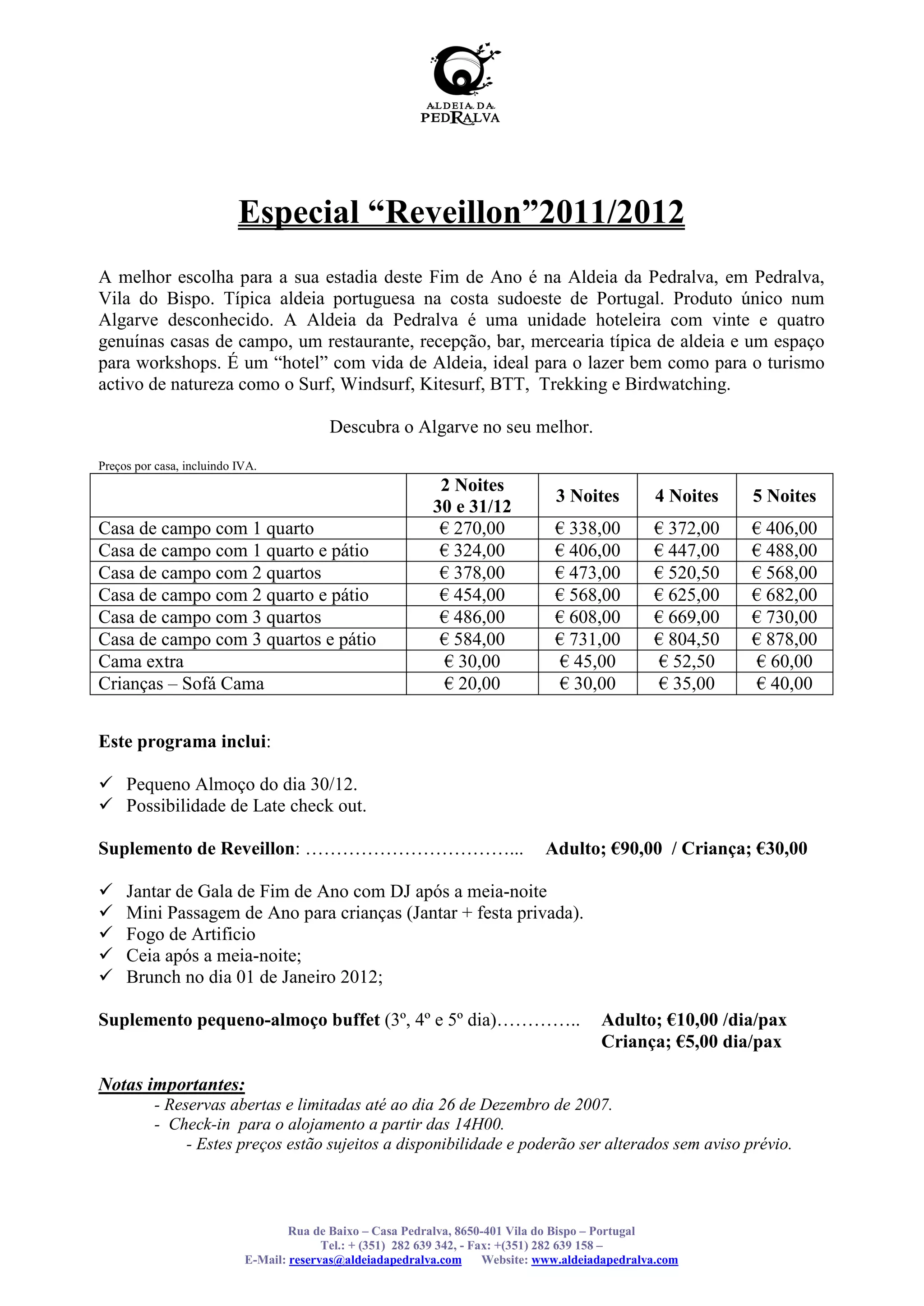 Este documento descreve as opções de alojamento e programação para o Réveillon de 2011/2012 na Aldeia da Pedralva, uma unidade hoteleira típica no sudoeste de Portugal. O documento lista preços para diferentes tipos de casas de campo para diferentes datas e inclui detalhes sobre as refeições, atividades e suplementos para a noite de ano novo.