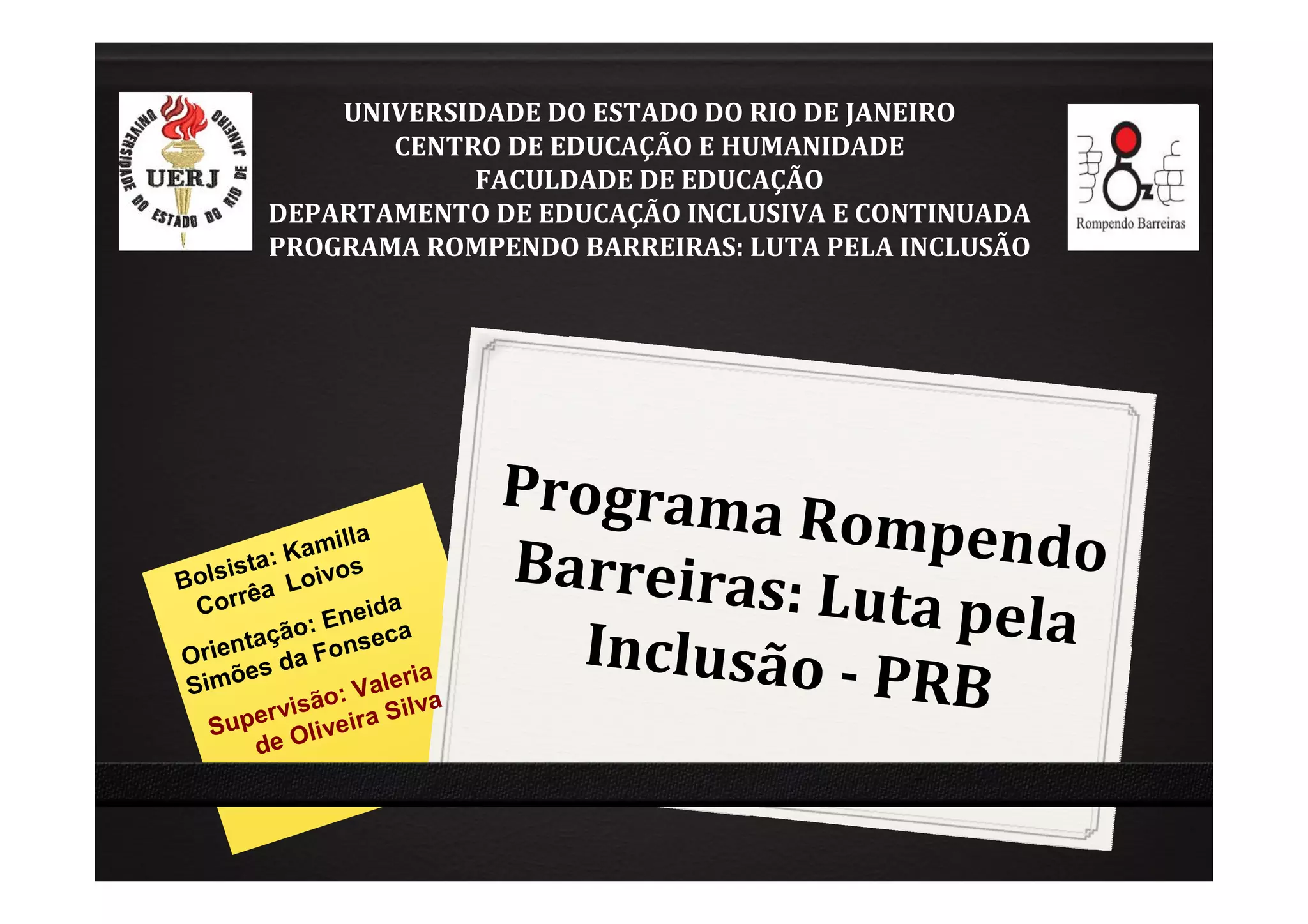O documento descreve o Programa Rompendo Barreiras (PRB) da Universidade do Estado do Rio de Janeiro. O PRB promove a inclusão de pessoas com deficiência na universidade há 23 anos, oferecendo tecnologias assistivas e formação de professores. O programa beneficia estudantes com necessidades educacionais especiais e defende os direitos das pessoas com deficiência.