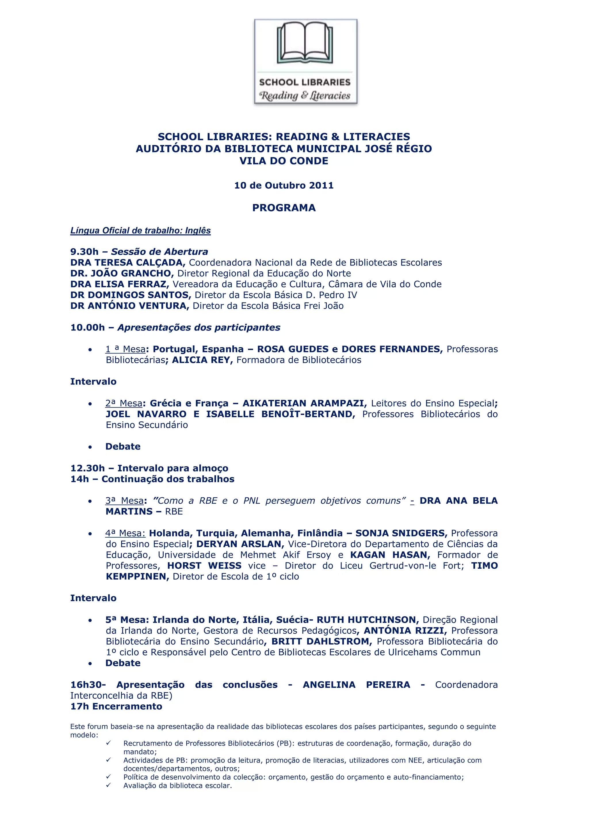 Este documento descreve o programa de um fórum sobre bibliotecas escolares que irá ocorrer em Vila do Conde, Portugal. O programa inclui sessões de abertura e apresentações de participantes de vários países sobre o recrutamento de bibliotecários, suas atividades, políticas de coleções e avaliação de bibliotecas escolares. O fórum visa compartilhar experiências entre países sobre como bibliotecas escolares promovem leitura e alfabetização.