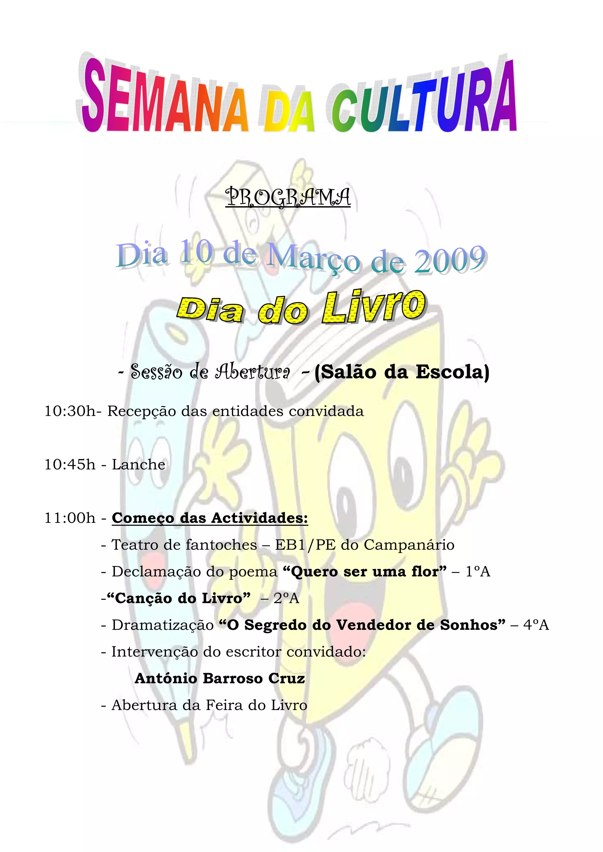 O documento descreve o programa de uma feira do livro em uma escola, incluindo atividades como teatro, poesia, dramatizações e uma palestra com um escritor convidado nos primeiros dias. Nos dias seguintes, há sessões de cinema, visitas de ilustradores e atletas, exibições musicais e jogos. As atividades ocorrem de 10 a 13 de março na biblioteca da escola.