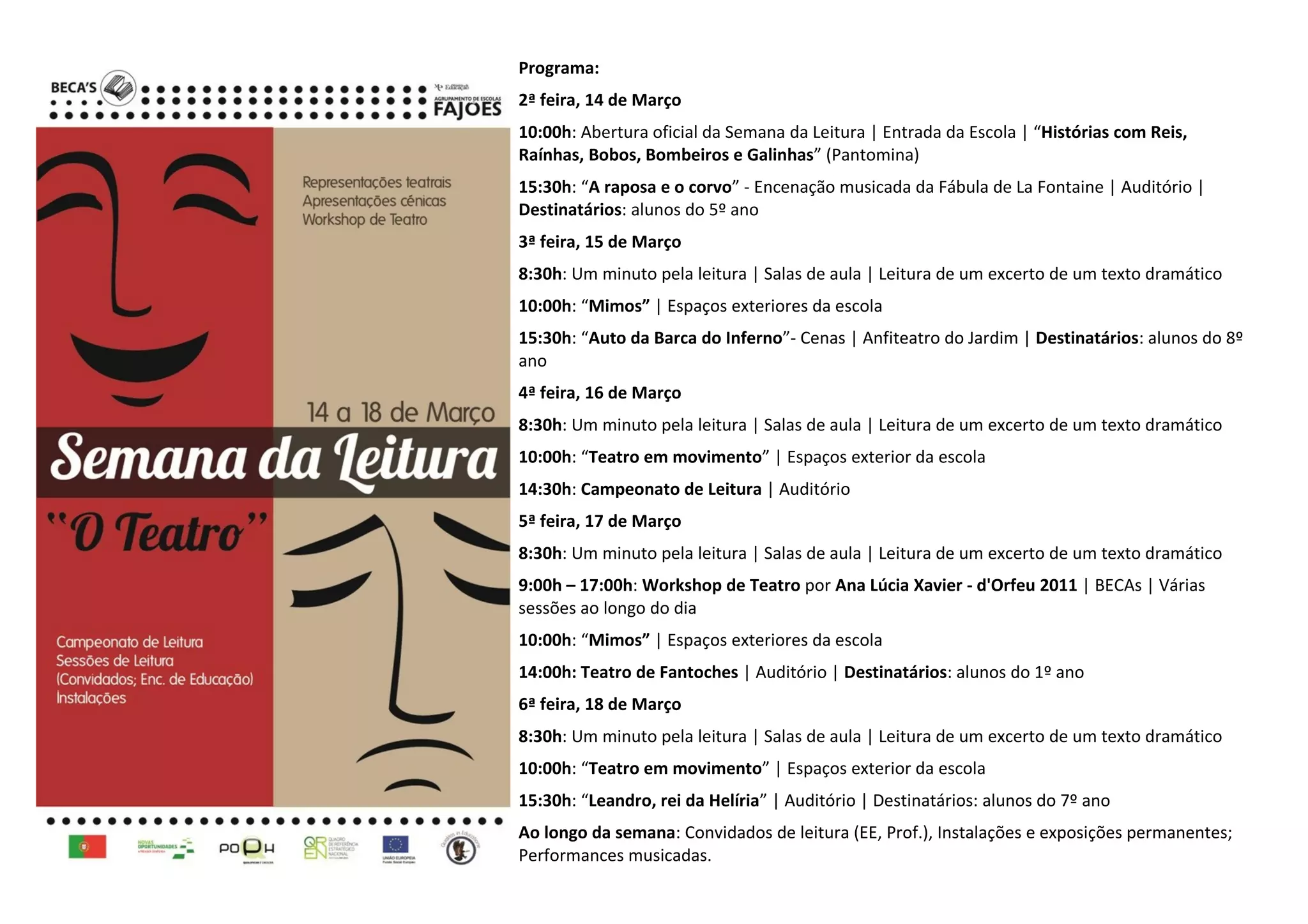 O programa apresenta as atividades planeadas para a Semana da Leitura na escola, incluindo encenações, performances, oficinas e campeonatos de leitura para diferentes anos de escolaridade ao longo dos cinco dias. Todas as atividades têm como objetivo promover a leitura e o teatro entre a comunidade escolar.