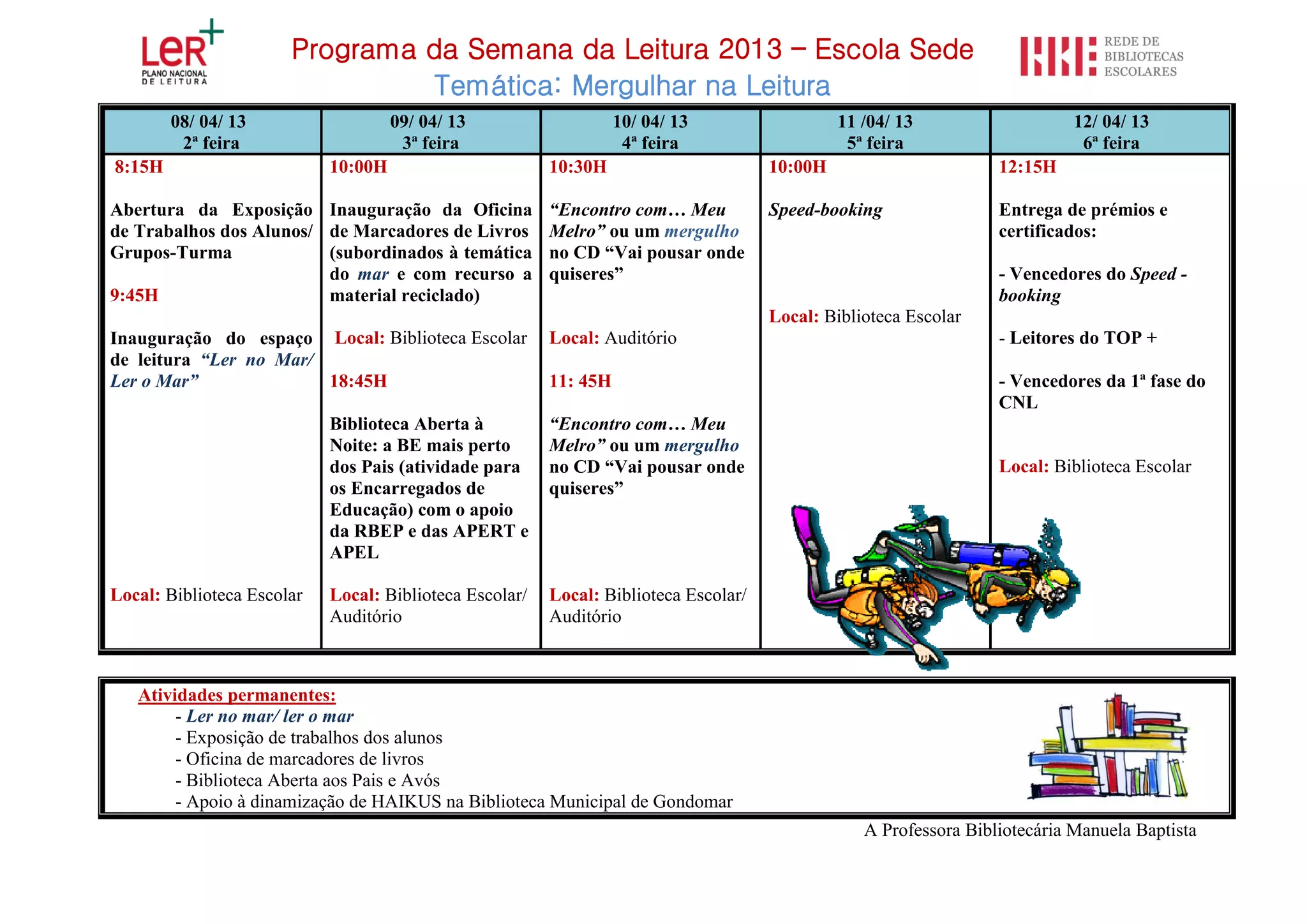 O documento descreve o programa da Semana da Leitura de 2013 na Escola Sede, com atividades diárias de 8 a 12 de abril incluindo a abertura de uma exposição, oficina de marcadores, contos, speed-booking e entrega de prémios no final da semana.