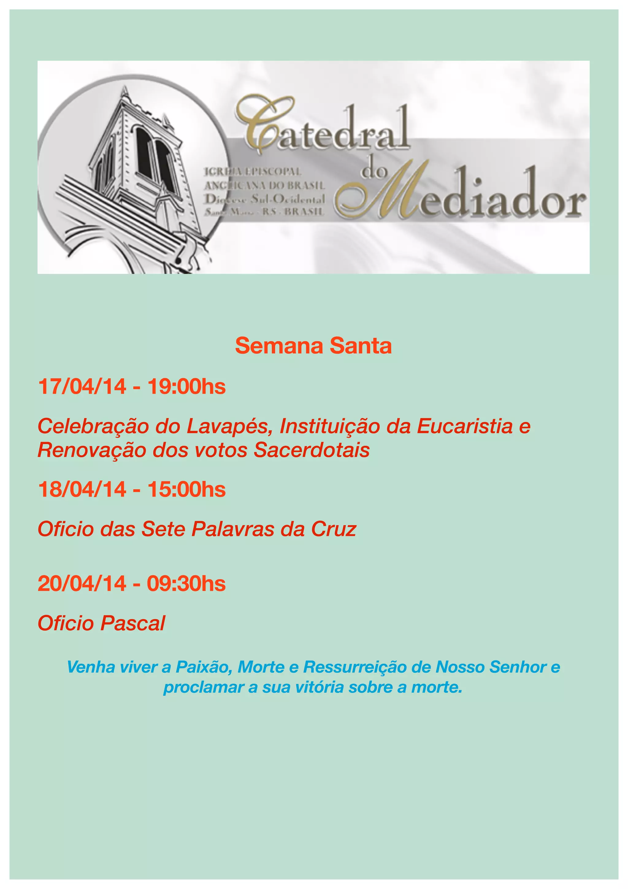 Celebrações religiosas da Semana Santa incluindo o Lavapés, a Instituição da Eucaristia, a Renovação dos Votos Sacerdotais, as Sete Palavras da Cruz e o Ofício Pascal para viver a Paixão, Morte e Ressurreição de Jesus Cristo.