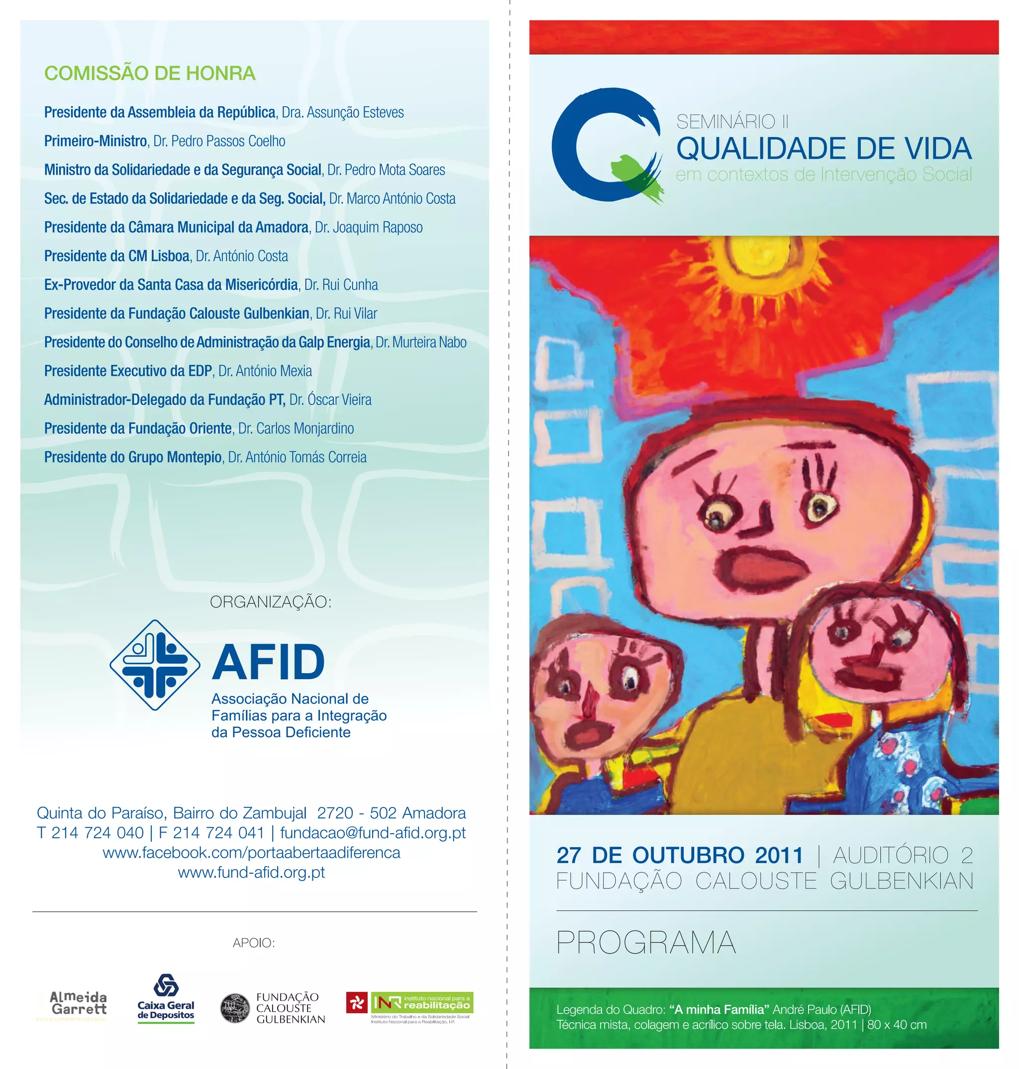 O documento apresenta o programa de um seminário sobre exclusão social, incluindo sessões de abertura, conferências e mesas redondas sobre qualidade de vida, impacto da crise econômica e das metodologias na intervenção social com idosos. Conta com a presença de políticos e especialistas da área.