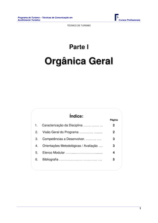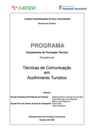 Este documento apresenta o programa da disciplina de Técnicas de Comunicação em Acolhimento Turístico para o curso de Técnico de Turismo. O programa aborda competências de comunicação e relacionamento interpessoal, relações públicas aplicadas ao turismo, e técnicas de atendimento e acolhimento de clientes, com o objetivo de formar profissionais capazes de garantir qualidade nos serviços de informação turística.