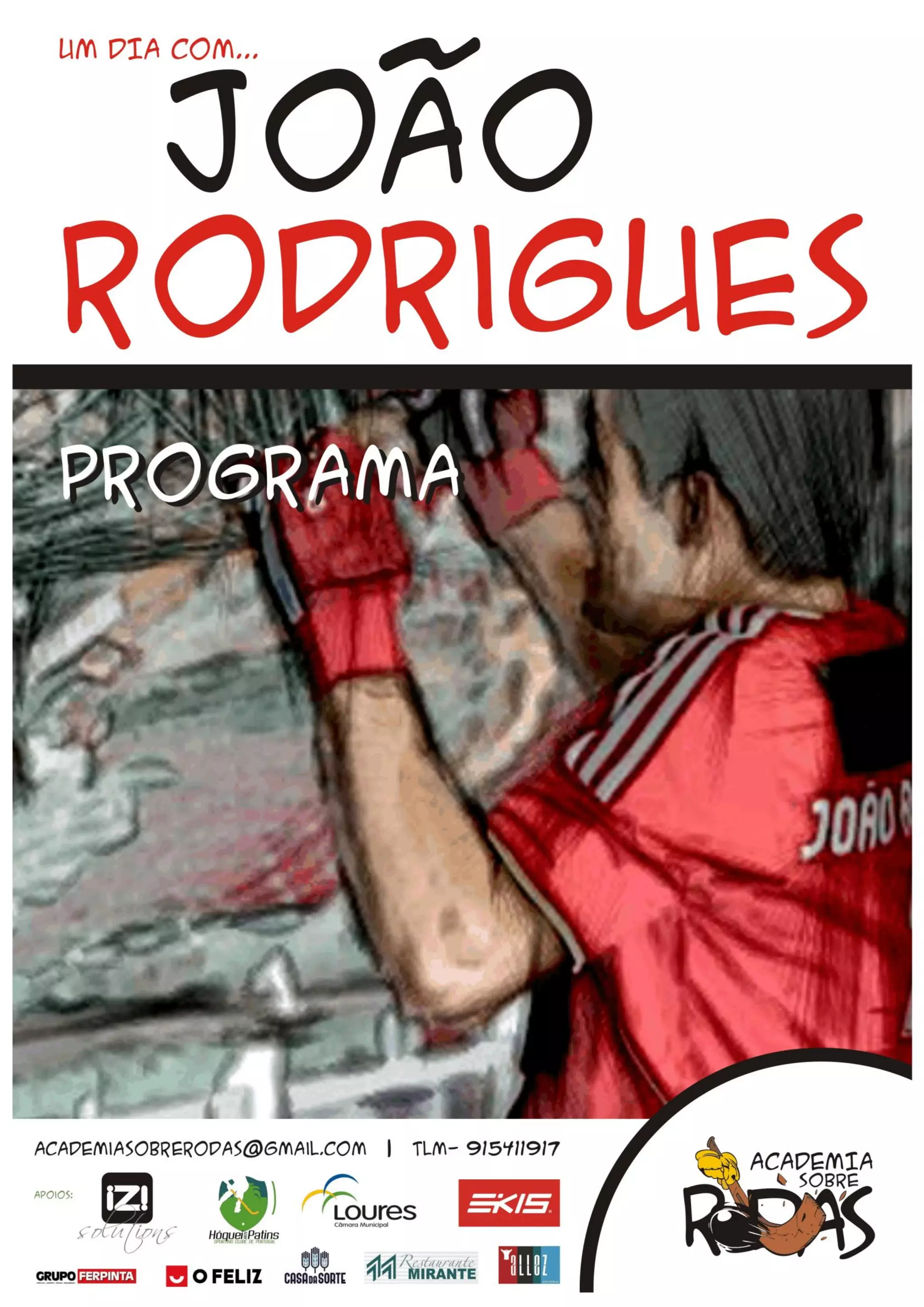 Este documento descreve o programa "Um dia com... João Rodrigues", um workshop de hóquei em patins organizado pela Academia sobre Rodas. O workshop irá acontecer no dia 12 de Maio e contará com a presença do jogador João Rodrigues do SL Benfica. O documento fornece detalhes sobre o programa, inscrição, atividades planejadas e agradecimentos.
