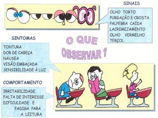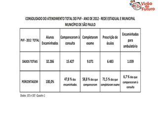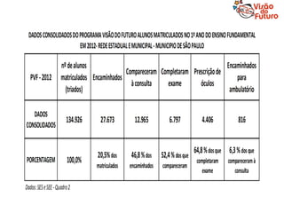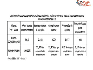 O documento descreve o Programa Visão do Futuro, que tem como objetivo prevenir e tratar problemas de visão em estudantes da rede pública. O programa inclui testes de acuidade visual, encaminhamento para consultas oftalmológicas, e fornecimento de óculos quando necessário. Ele é executado em parceria entre secretarias de educação e saúde.
