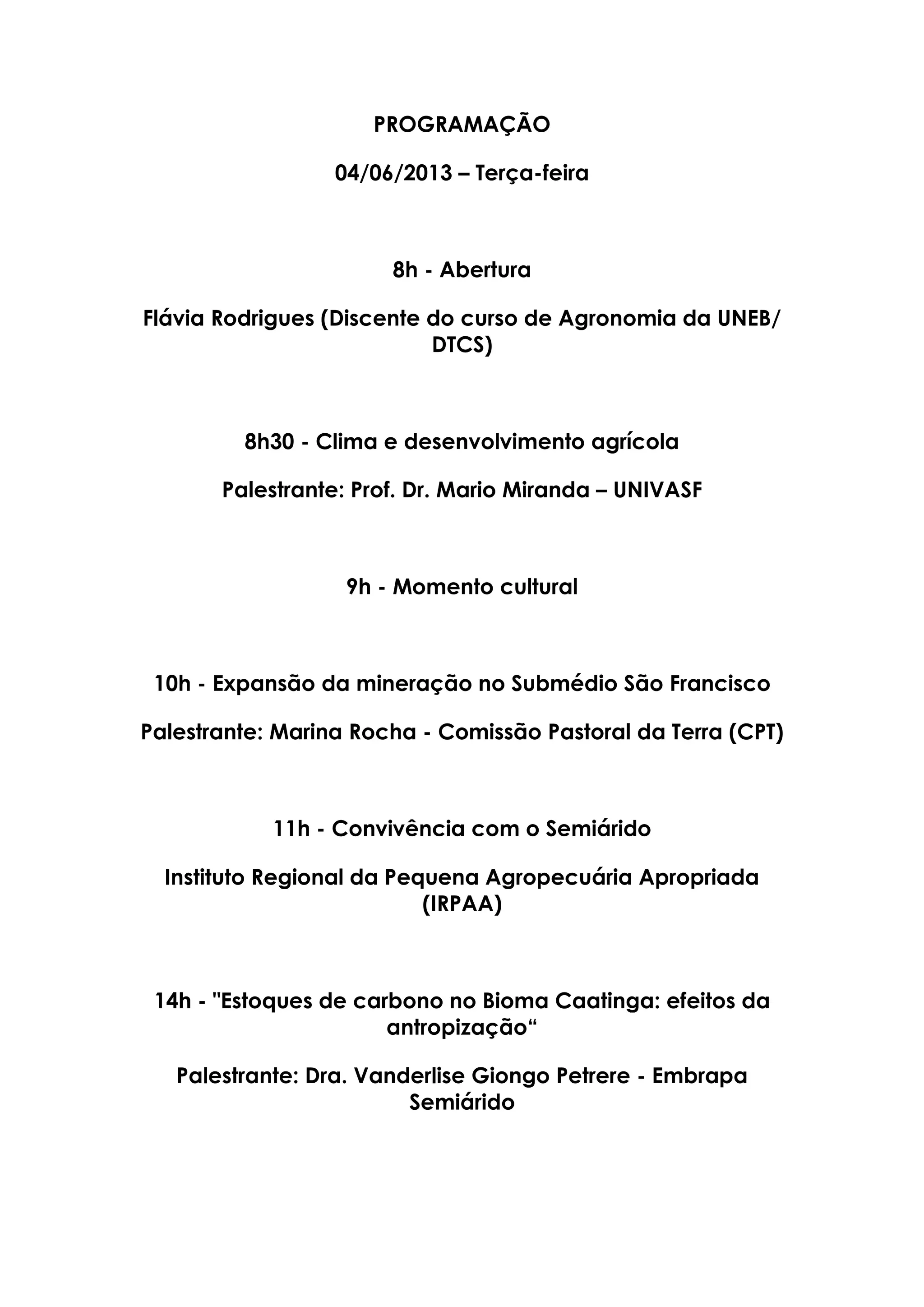 O programa apresenta uma série de palestras e atividades sobre temas relacionados à agricultura, meio ambiente e recursos naturais na região do Submédio São Francisco ao longo de três dias, incluindo discussões sobre clima e desenvolvimento agrícola, expansão da mineração, convivência com o semiárido, estoques de carbono na Caatinga, nematóides em frutíferas irrigadas e popularização da ciência do solo, além de oficinas de educação ambiental e uma visita técnica.