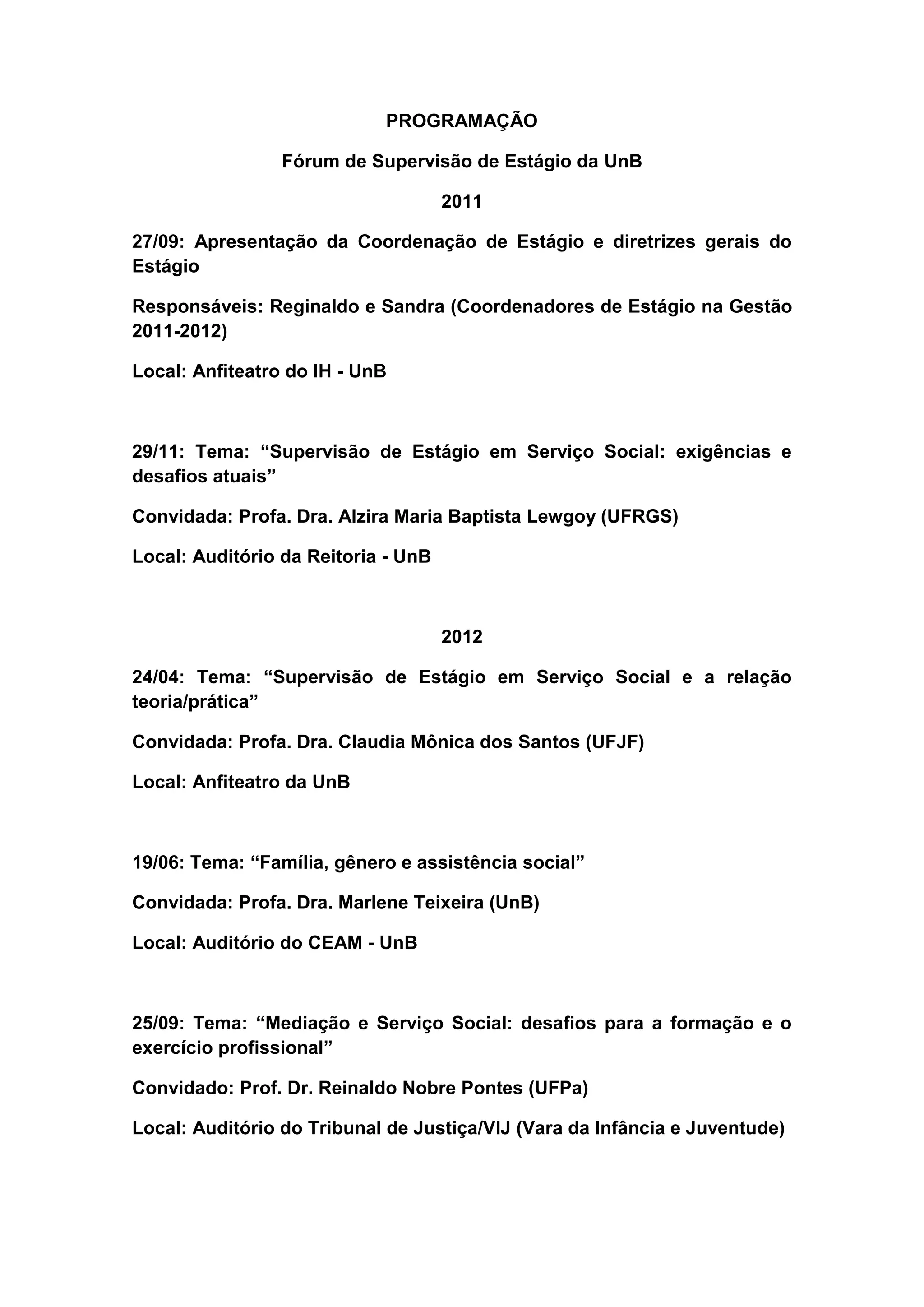 O documento apresenta a programação de um fórum de supervisão de estágio da UnB para os anos de 2011 a 2013, com datas, temas e convidados para discussões sobre supervisão de estágio em serviço social.