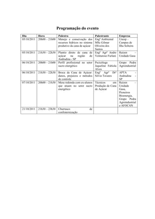 O documento apresenta a programação de um evento com palestras sobre temas relacionados à cana-de-açúcar ao longo de três dias, incluindo assuntos como manejo de recursos hídricos, plantio direto, perfis profissionais e controle de pragas. Haverá também uma mesa redonda com ex-alunos da área e um churrasco de confraternização no último dia.
