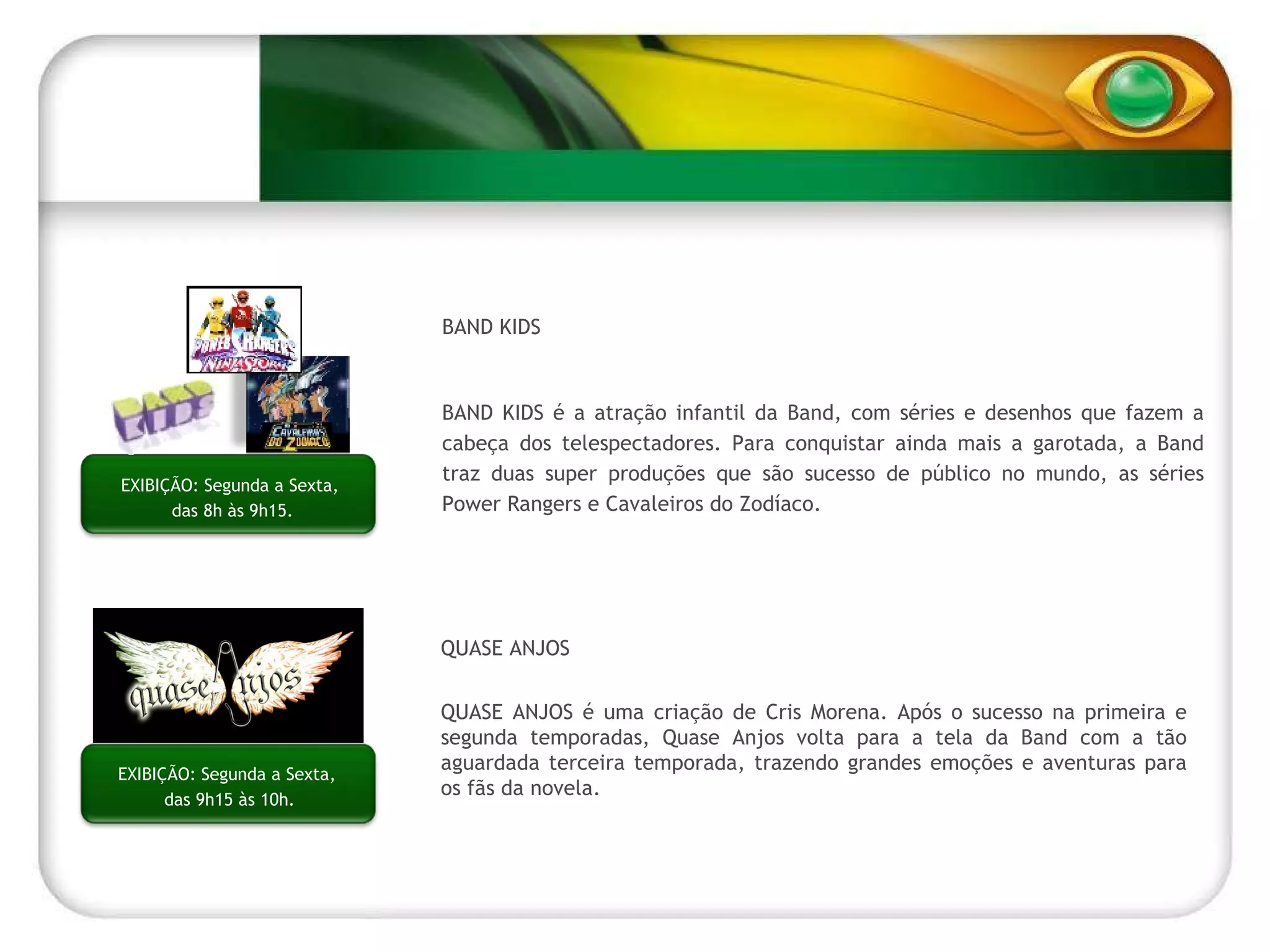 BAND KIDS BANDKIDS é a atração infantil da Band, com séries e desenhos que fazem a cabeça dos telespectadores. Para conquistar ainda mais a garotada, a Band traz duas super produções que são sucesso de público no mundo, as séries Power Rangers e Cavaleiros do Zodíaco. EXIBIÇÃO: Segunda a Sexta, das 8h às 9h15. EXIBIÇÃO: Segunda a Sexta, das 9h15 às 10h. QUASE ANJOS QUASE ANJOS é uma criação de Cris Morena. Após o sucesso na primeira e segunda temporadas, Quase Anjos volta para a tela da Band com a tão aguardada terceira temporada, trazendo grandes emoções e aventuras para os fãs da novela.