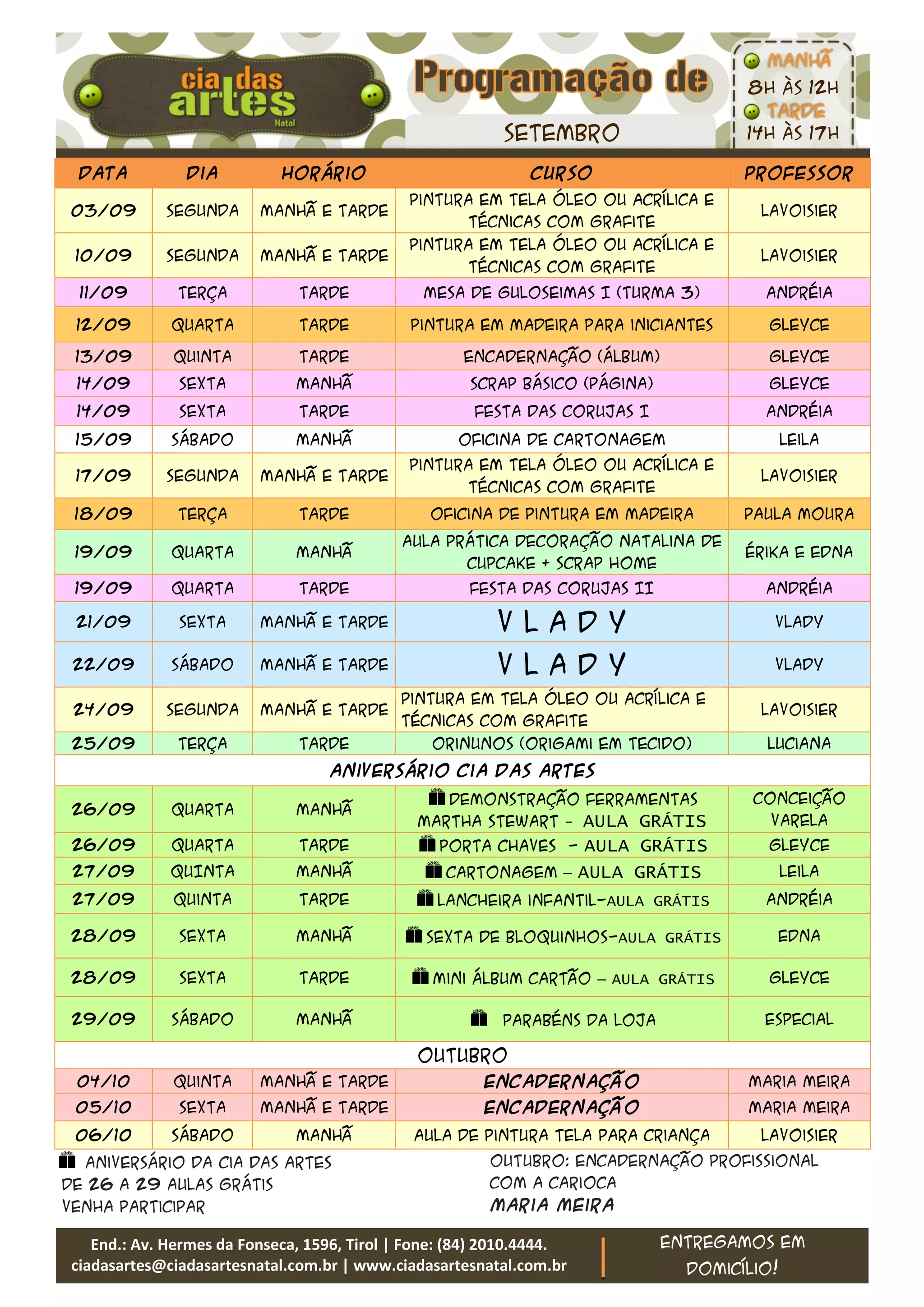 O documento apresenta a programação de cursos e oficinas de artes da Cia das Artes para os meses de setembro e outubro, com datas, horários, cursos e professores. Algumas atividades como pintura em tela, encadernação e oficinas serão oferecidas em vários dias, com destaque para aulas gratuitas de 26 a 29 de setembro e o curso de encadernação profissional com Maria Meira em outubro.