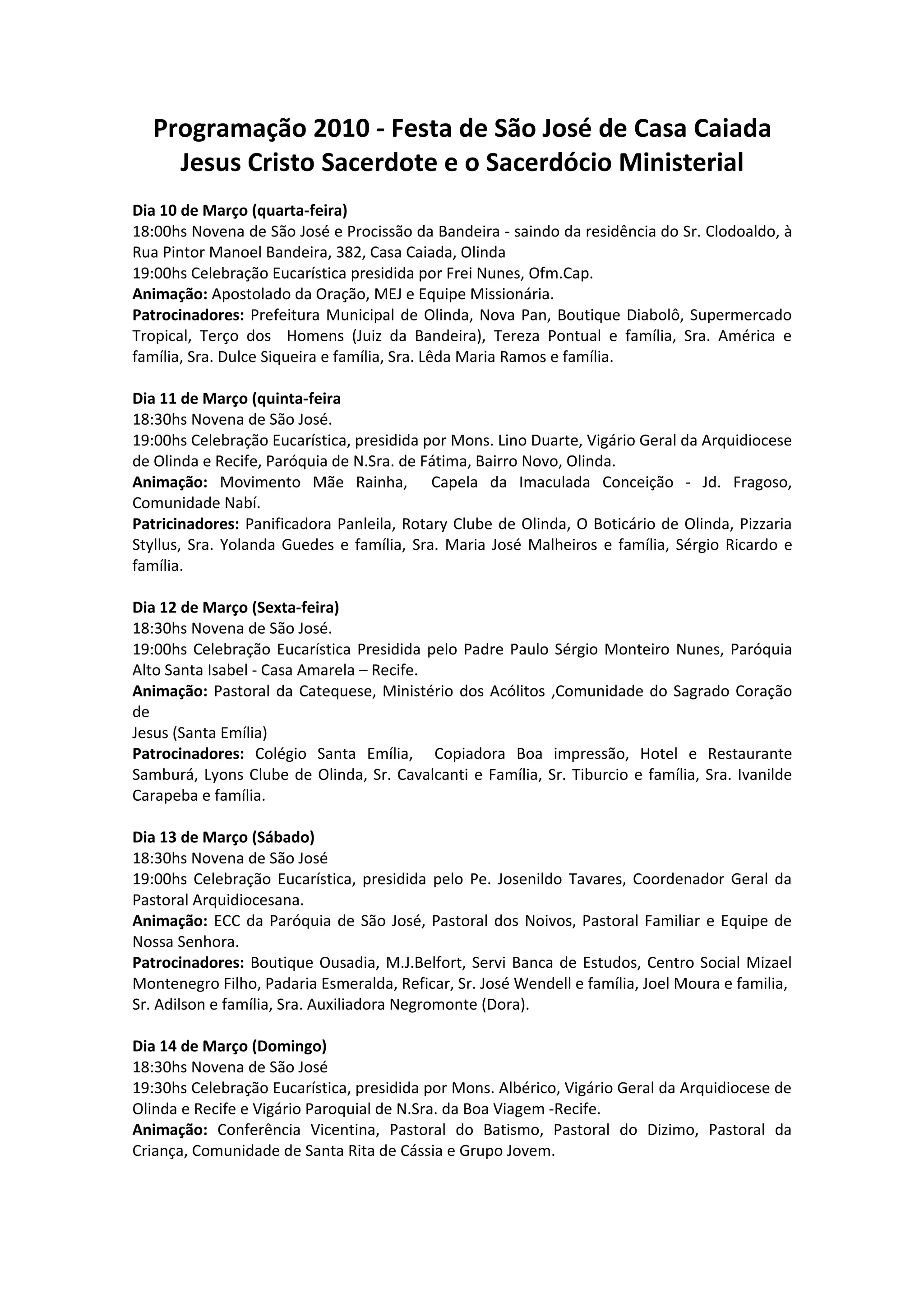 Este documento apresenta a programação da Festa de São José de Casa Caiada, que ocorrerá de 10 a 19 de março. A programação inclui novenas, missas e procissões diárias, com diferentes celebrações presididas por bispos e padres. Há também detalhes sobre os patrocinadores e animadores de cada dia. O documento termina agradecendo a Deus e a São José, e a todos que contribuíram para a realização da festa.