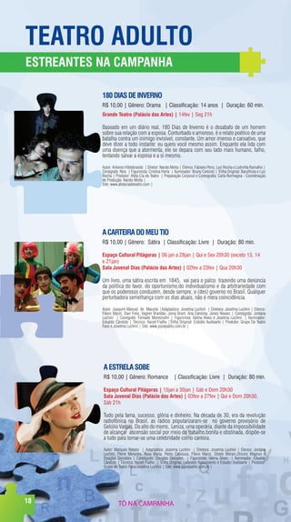 O documento resume três peças de teatro que estarão em cartaz na cidade. A primeira, "180 Dias de Inverno", é um drama baseado em um diário real sobre uma relação conturbada entre um homem e sua esposa doente. A segunda, "A Cartela do Meu Tio", é uma sátira política baseada em um livro de 1845 que faz uma denúncia da política do favor no Brasil. A terceira, "A Estrela Sobe", é um romance ambientado na década de 1930 sobre uma operária que busca ascensão social através do canto