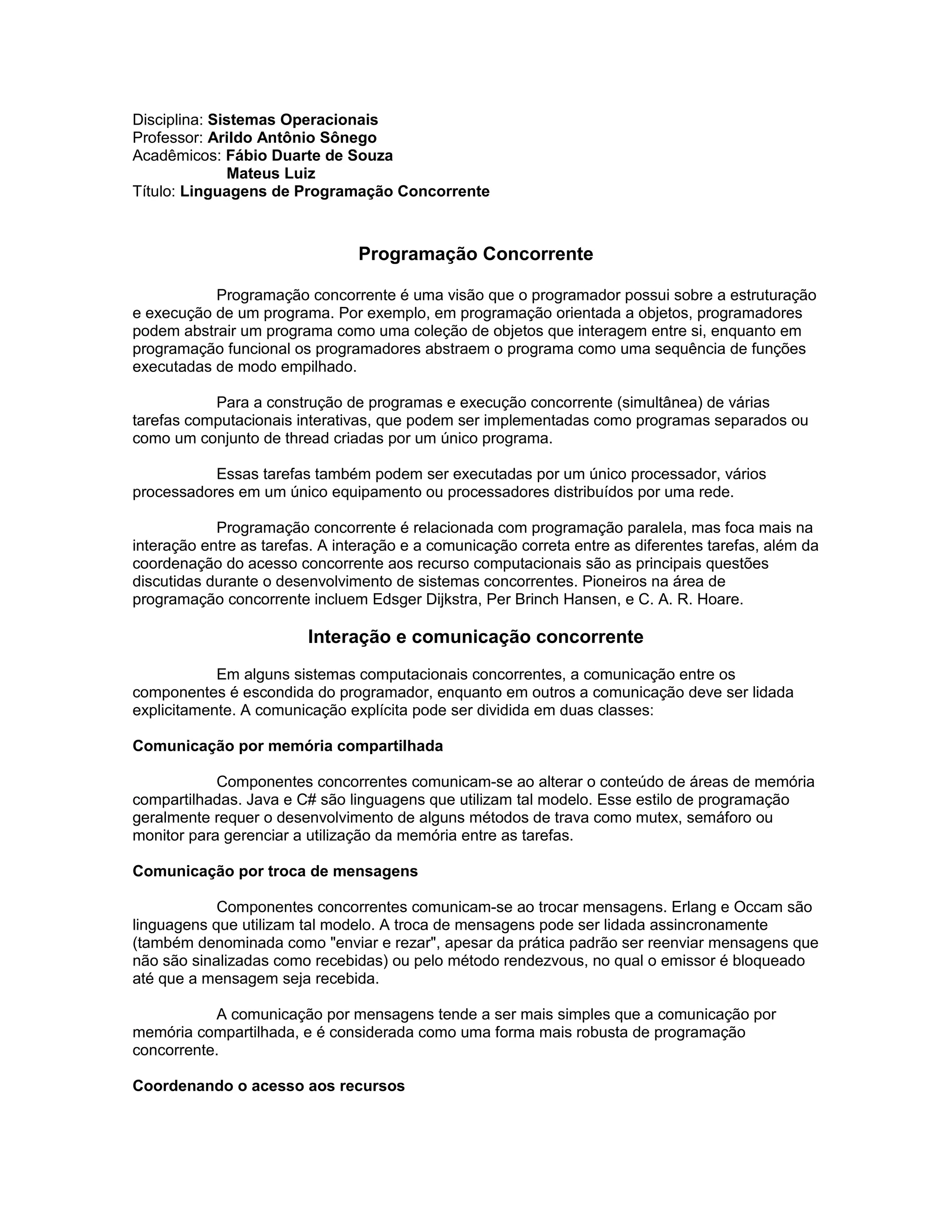 O documento discute programação concorrente, abordando modelos de comunicação entre tarefas como memória compartilhada e troca de mensagens, além de técnicas para coordenar acesso a recursos compartilhados. Também apresenta linguagens para programação concorrente como Erlang, Limbo e OCCAM, destacando recursos e exemplos de código em cada uma.