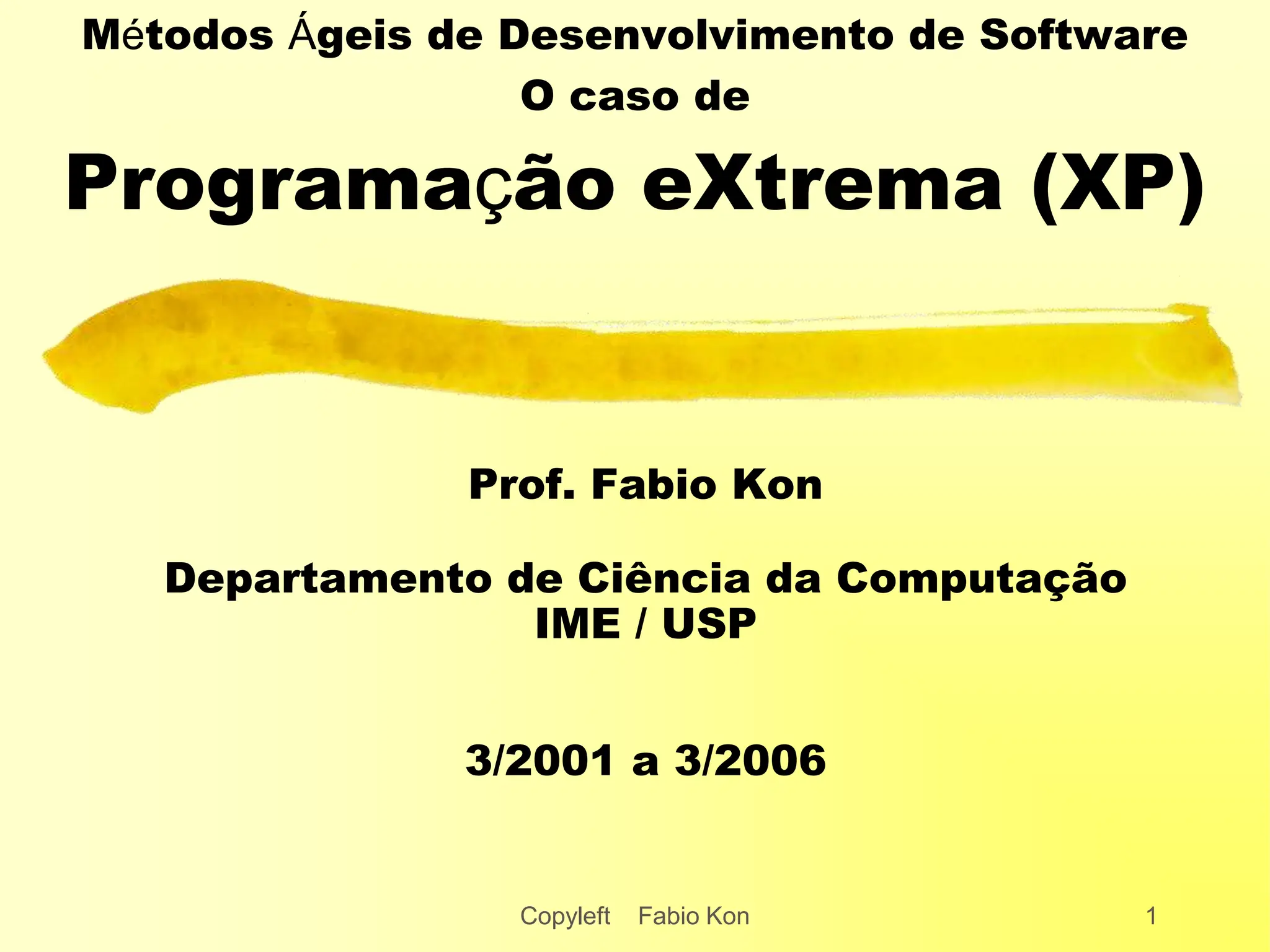 O documento discute métodos ágeis de desenvolvimento de software, focando na programação extrema (XP) como uma abordagem para melhorar a qualidade e flexibilidade no desenvolvimento. O autor critica metodologias tradicionais, enfatizando a importância da colaboração com os clientes, adaptação a mudanças e entrega rápida de sistemas. Também são abordadas práticas específicas da XP e outros métodos ágeis, ressaltando a necessidade de comunicação eficaz e um ambiente de trabalho colaborativo.