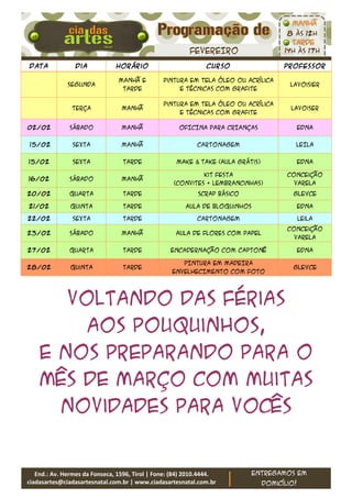 O documento apresenta a programação de cursos e oficinas de artes da Ciadas Artes para as semanas de 14 a 23 de fevereiro. As aulas incluem pintura em tela a óleo ou acrílica, cartonagem, scrap básico, bloquinhos, flores de papel e pintura em madeira. Algumas aulas são gratuitas.