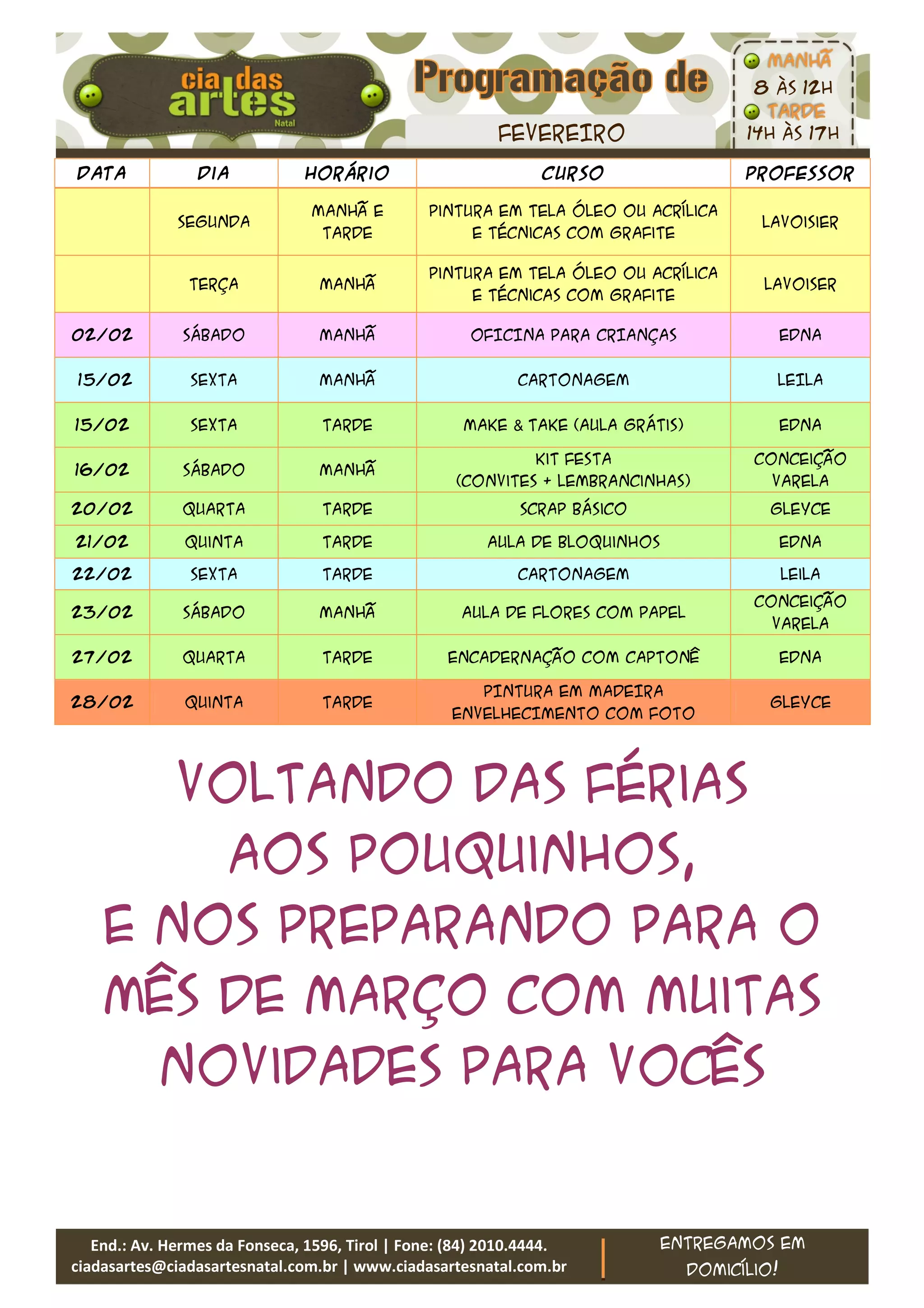 O documento apresenta a programação de cursos da Ciadas Artes Natal para o mês de fevereiro. Contém informações sobre datas, horários, cursos e professores durante a semana e aos sábados, com oficinas para crianças e adultos sobre pintura, cartonagem, scrapbooking e artesanato.