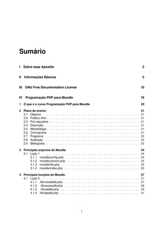 Este documento fornece informações sobre um curso de programação PHP para Moodle, incluindo seu objetivo, público-alvo, pré-requisitos, descrição, metodologia, cronograma, programa, avaliação e bibliografia. Ele também discute os principais arquivos e funções do Moodle, como config.php, version.php, file.php e index.php, além de módulos, permissões de usuário, sistema de seleção de idioma e criação de novos módulos.