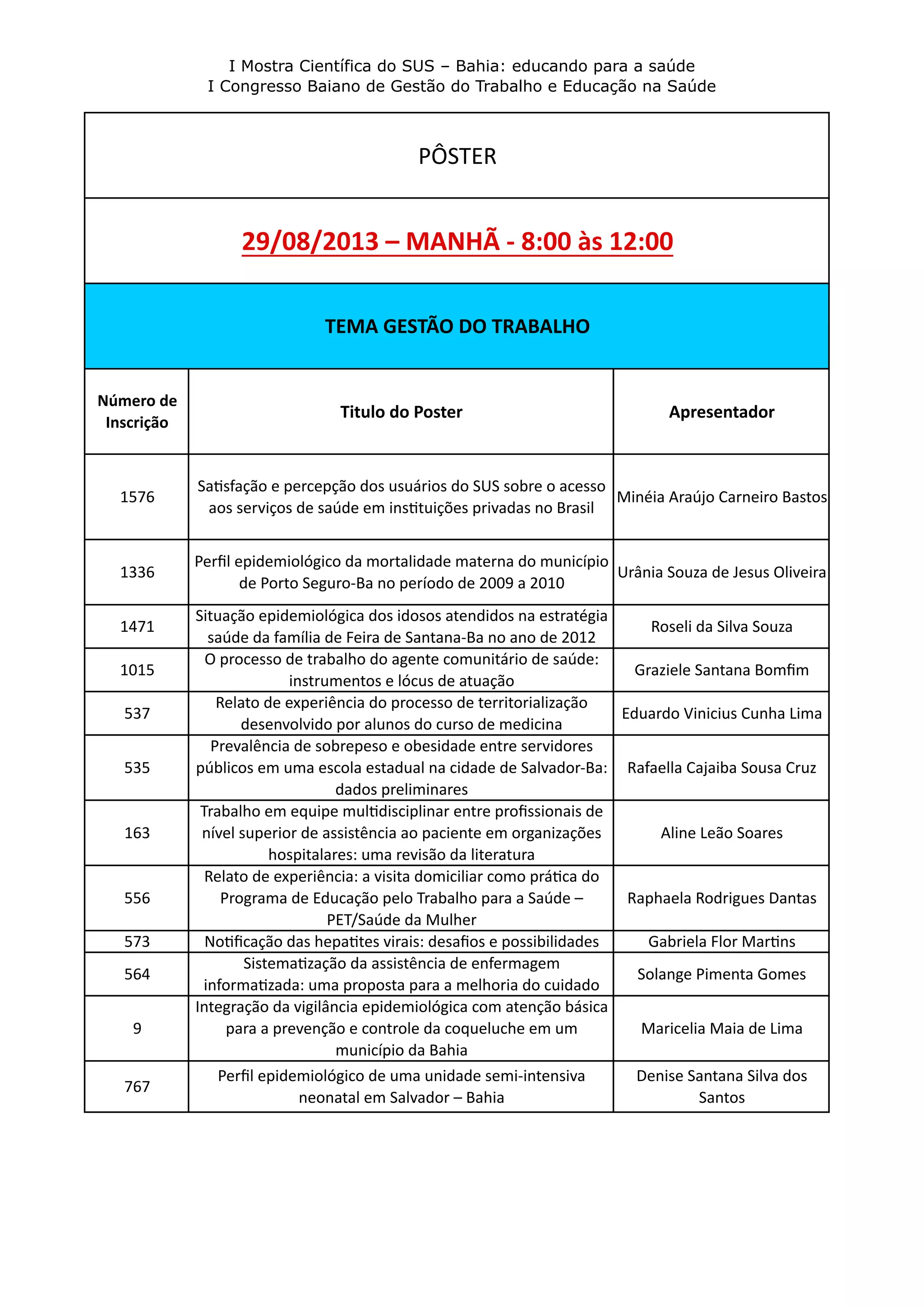 Este documento lista os títulos, apresentadores e números de inscrição de vários posters apresentados em uma mostra científica sobre o Sistema Único de Saúde na Bahia. Os posters abordam temas como gestão do trabalho, educação na saúde, promoção da saúde e experiências em unidades de saúde.