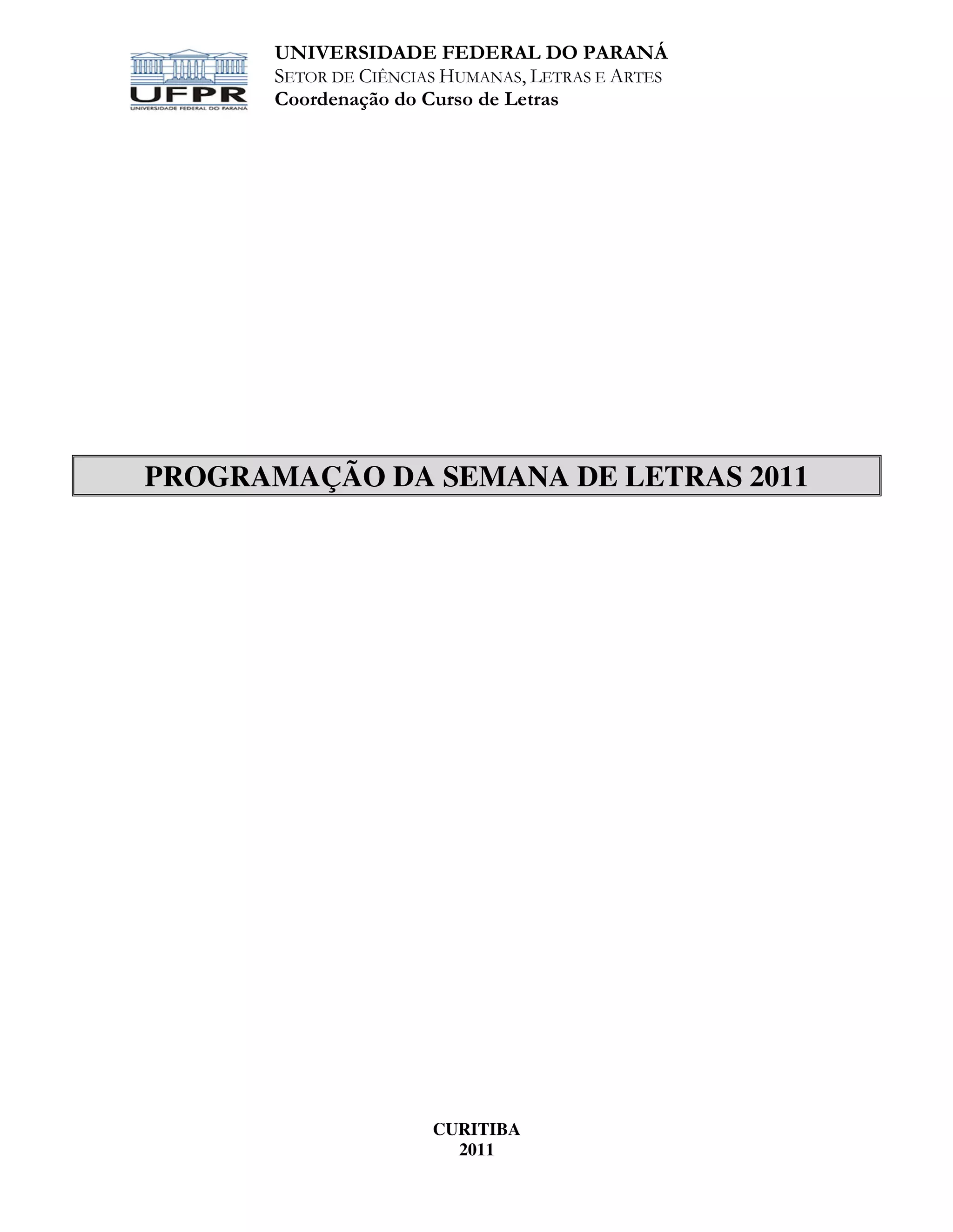 Este documento apresenta a programação da Semana de Letras da Universidade Federal do Paraná em 2011. A programação inclui conferências, palestras, mesas-redondas e sessões de comunicações individuais e coordenadas organizadas em quatro eixos temáticos. Todas as atividades ocorrerão no Edifício Dom Pedro I entre os dias 23 e 27 de maio.