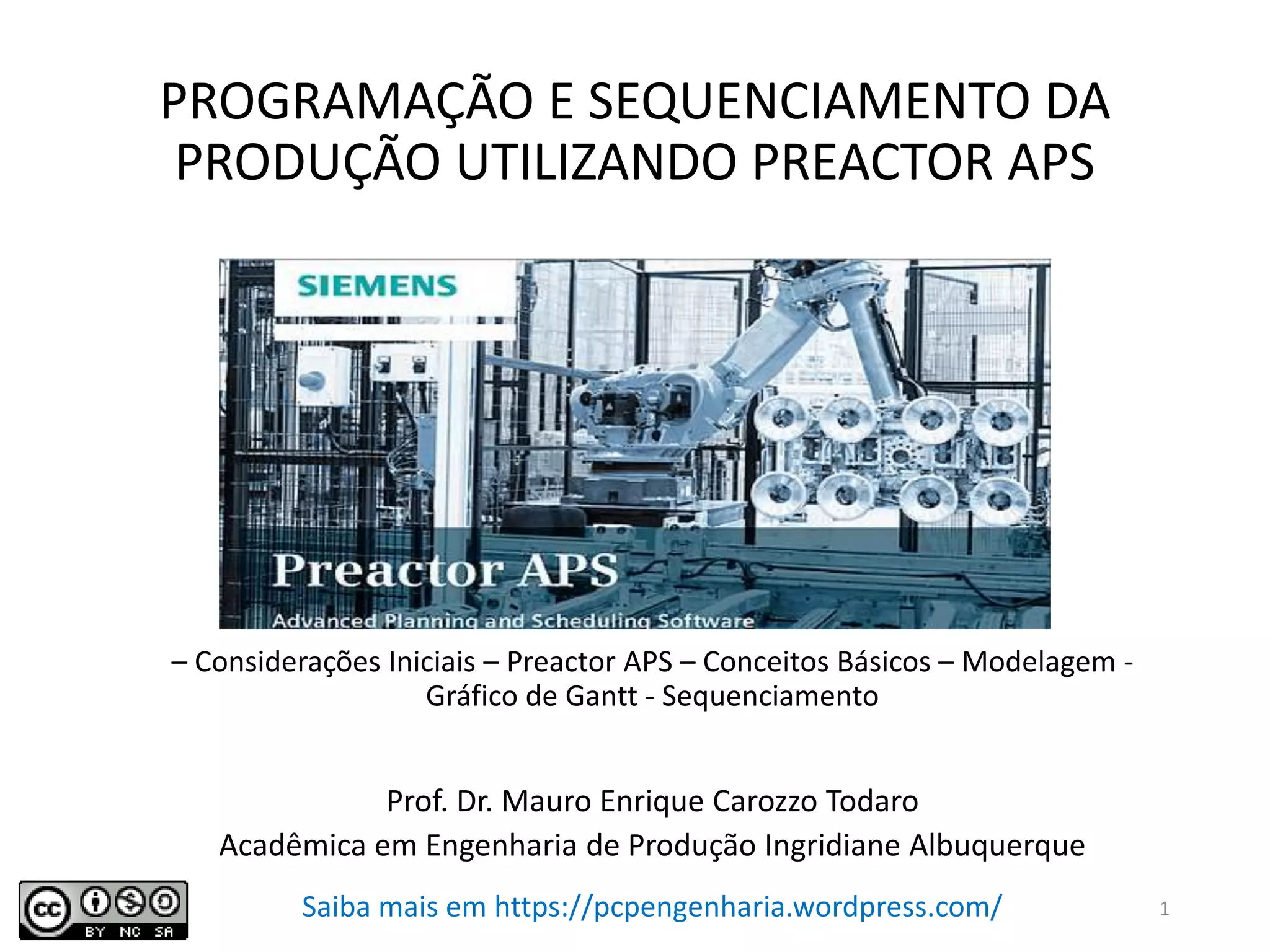 O documento discute conceitos básicos de programação e sequenciamento da produção utilizando o software Preactor APS. Aborda considerações iniciais sobre planejamento, programação e controle da produção, conceitos do Preactor APS, modelagem no software e sequenciamento da produção.