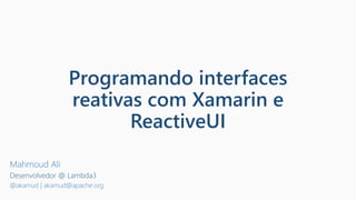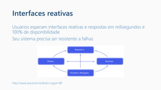 O documento aborda a programação de interfaces reativas utilizando Xamarin e ReactiveUI, destacando a importância de sistemas que respondem rapidamente e com alta disponibilidade. Ele introduz as Reactive Extensions, que permitem a composição de programas assíncronos através de eventos observáveis, e descreve o paradigma funcional e o padrão observer. Além disso, menciona o uso do ReactiveUI para simplificar a criação de interfaces reativas e a reutilização de código entre plataformas.