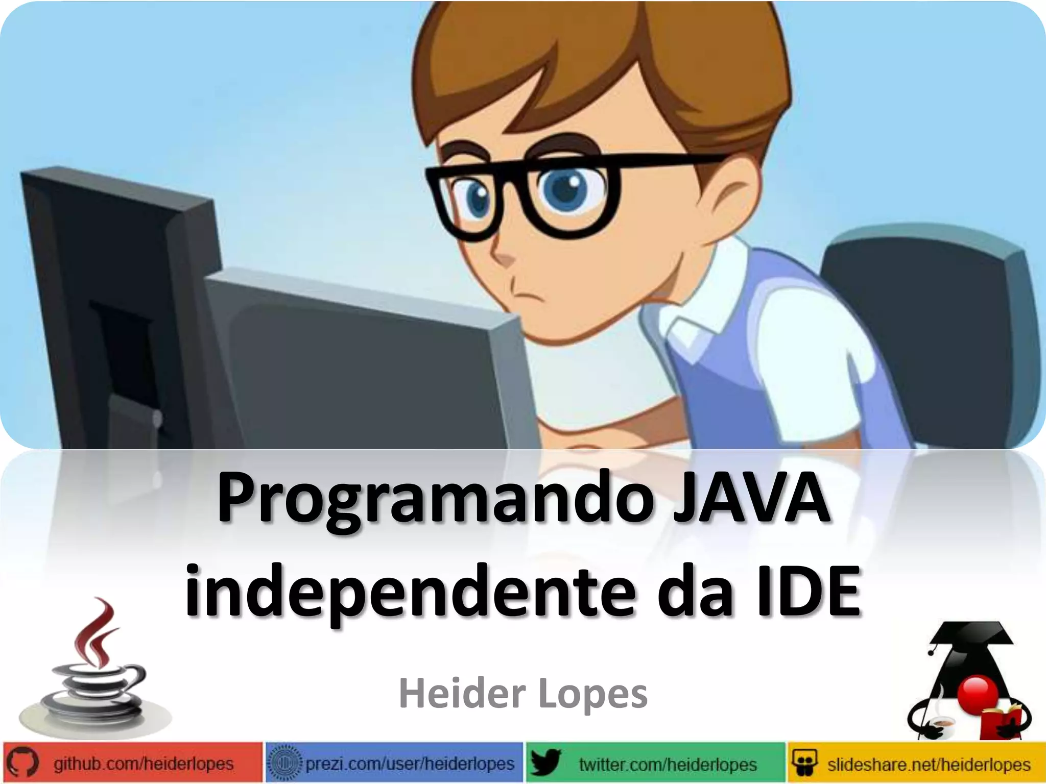 O documento discute programação em Java, incluindo o que é Java, suas edições principais (J2SE, J2ME, J2EE), e ferramentas como JVM, JRE, JDK e IDEs. Também aborda desenvolvimento em Java independente de IDEs usando Maven.