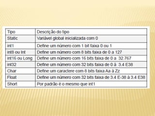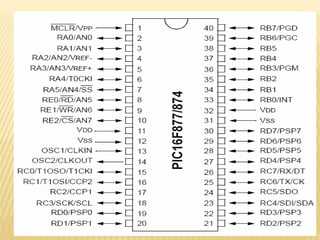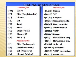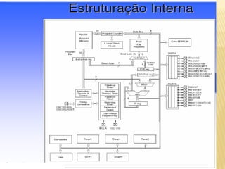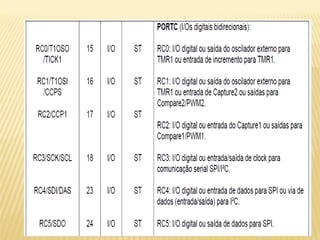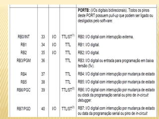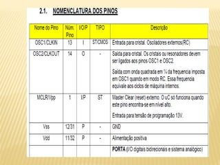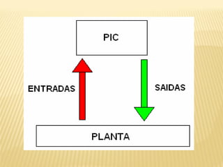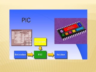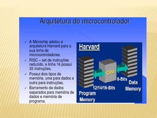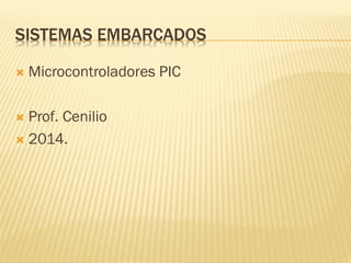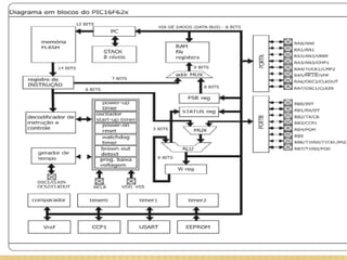 O documento apresenta uma introdução aos sistemas embarcados, microcontroladores PIC e programação embarcada, descrevendo as características e aplicações dos PICs, memória, registradores, pilha e programação em C.