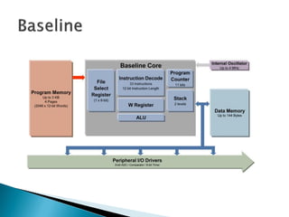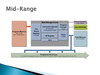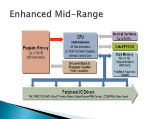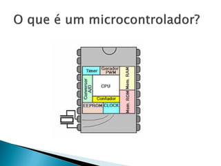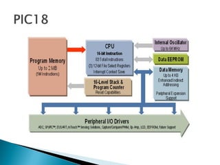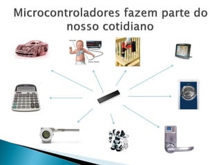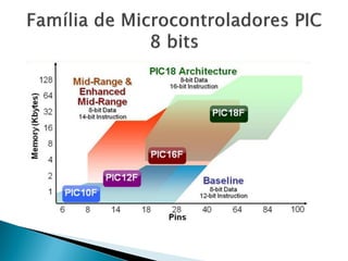 O documento discute a escolha da linguagem de programação para microcontroladores PIC da Microchip, comparando Assembly e C. Ele também lista recursos necessários como compilador, programador e literatura.