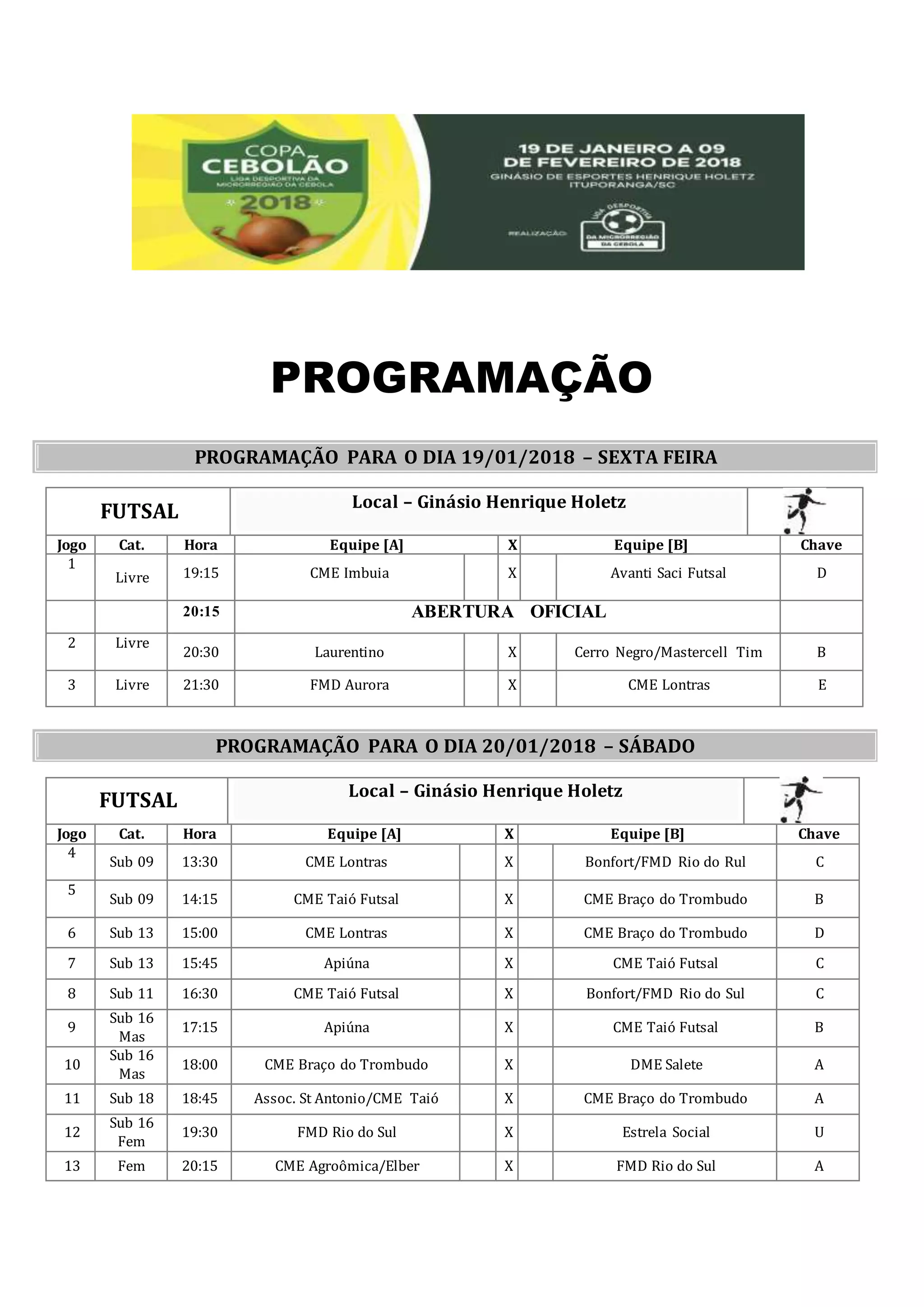 O documento apresenta a programação de jogos de futsal para os dias 19, 20 e 21 de janeiro de 2018. No dia 19, os jogos começam às 19h15 e envolvem categorias livres. No dia 20, os jogos começam às 13h30 e envolvem categorias sub-09, sub-11, sub-13, sub-16 masculino e feminino e sub-18. No dia 21, os jogos começam às 09h30 e envolvem categorias sub-11, sub-13, sub-16 masculino e feminino, sub-18 masculino e feminino