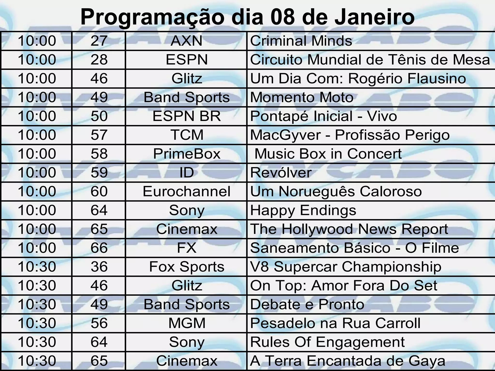 O documento lista a programação de vários canais de TV para o dia 08 de Janeiro, incluindo séries, filmes e eventos esportivos entre 10h e 00h. Os principais programas são Criminal Minds na AXN, Copa do Rei na ESPN e Pretty Little Liars no Boomerang.