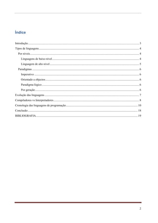 O documento fornece um resumo sobre as linguagens de programação, discutindo os tipos de linguagens (de baixo e alto nível), paradigmas (imperativo, orientado a objetos, lógico), evolução das linguagens, e compiladores vs interpretadores.