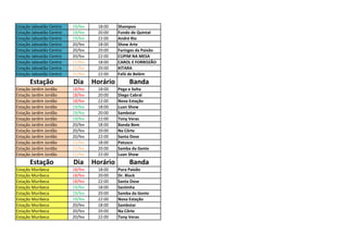 O documento lista as apresentações musicais que ocorrerão em diferentes estações de metrô nos dias 18, 19, 20 e 21 de fevereiro. É fornecido o nome da estação, data, horário e nome da banda para cada apresentação.