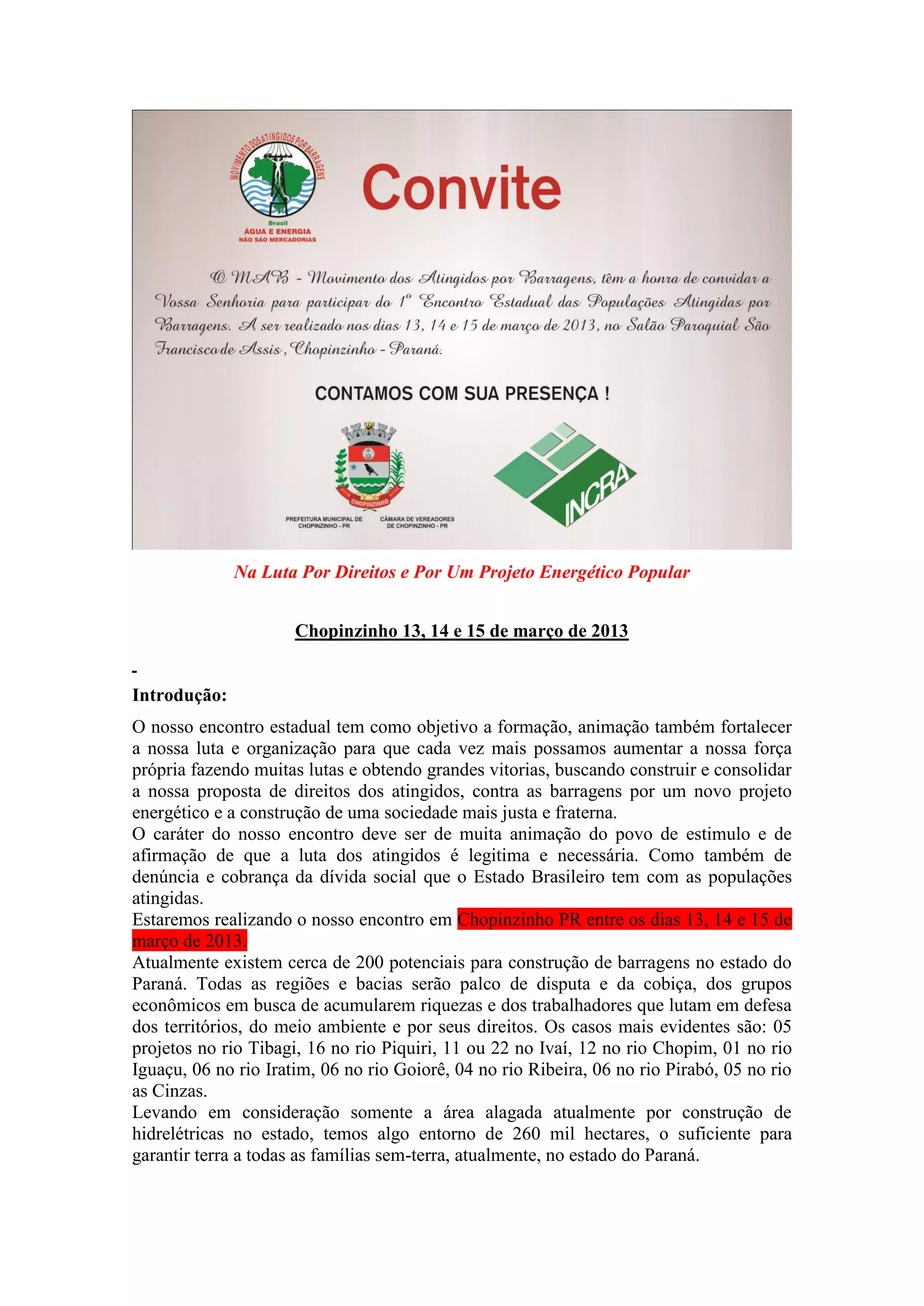 Este documento descreve um encontro estadual de atingidos por barragens no Paraná entre 13 e 15 de março de 2013. O objetivo do encontro é fortalecer a luta e organização dos atingidos para defender seus direitos e propor um novo modelo energético. O documento lista os projetos hidrelétricos planejados no estado e objetivos como debater o atual modelo energético e estratégias de organização.