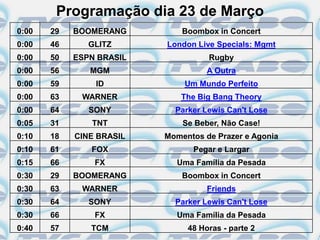 A programação lista os canais de TV e os programas/filmes que serão exibidos no dia 23 de Março entre 0:00 e 10:00. Os principais gêneros incluem séries, filmes, esportes e música. Vários canais exibirão episódios de séries populares como Friends, The Big Bang Theory e American Dad durante a programação da manhã.