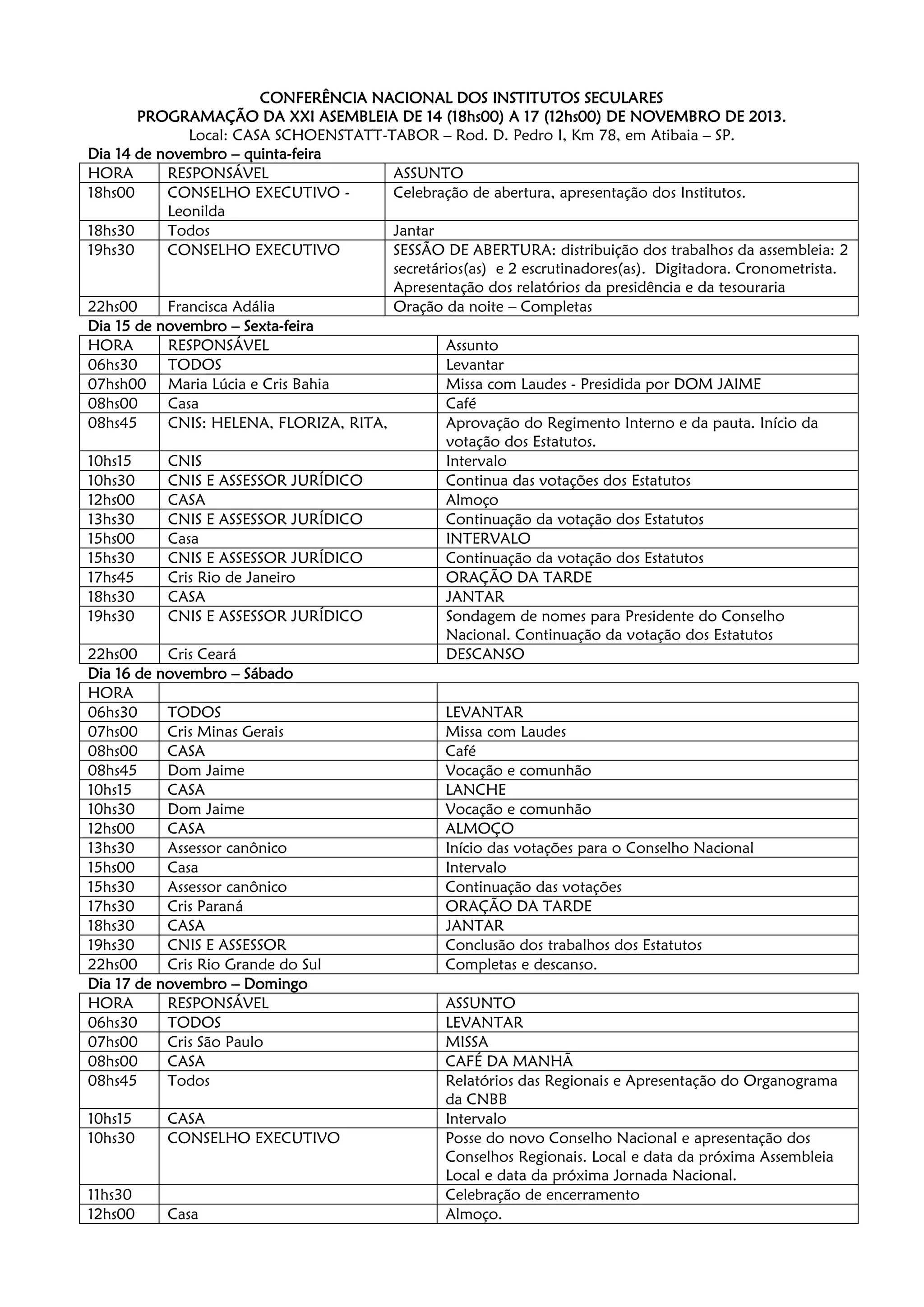 A conferência nacional dos institutos seculares ocorrerá de 14 a 17 de novembro de 2013 na Casa Schoenstatt-Tabor em Atibaia, SP. O programa inclui discussões sobre estatutos, votações, missas e orações. O assessor canônico liderará votações para o novo conselho nacional no sábado e no domingo haverá relatórios, posse do novo conselho e encerramento.