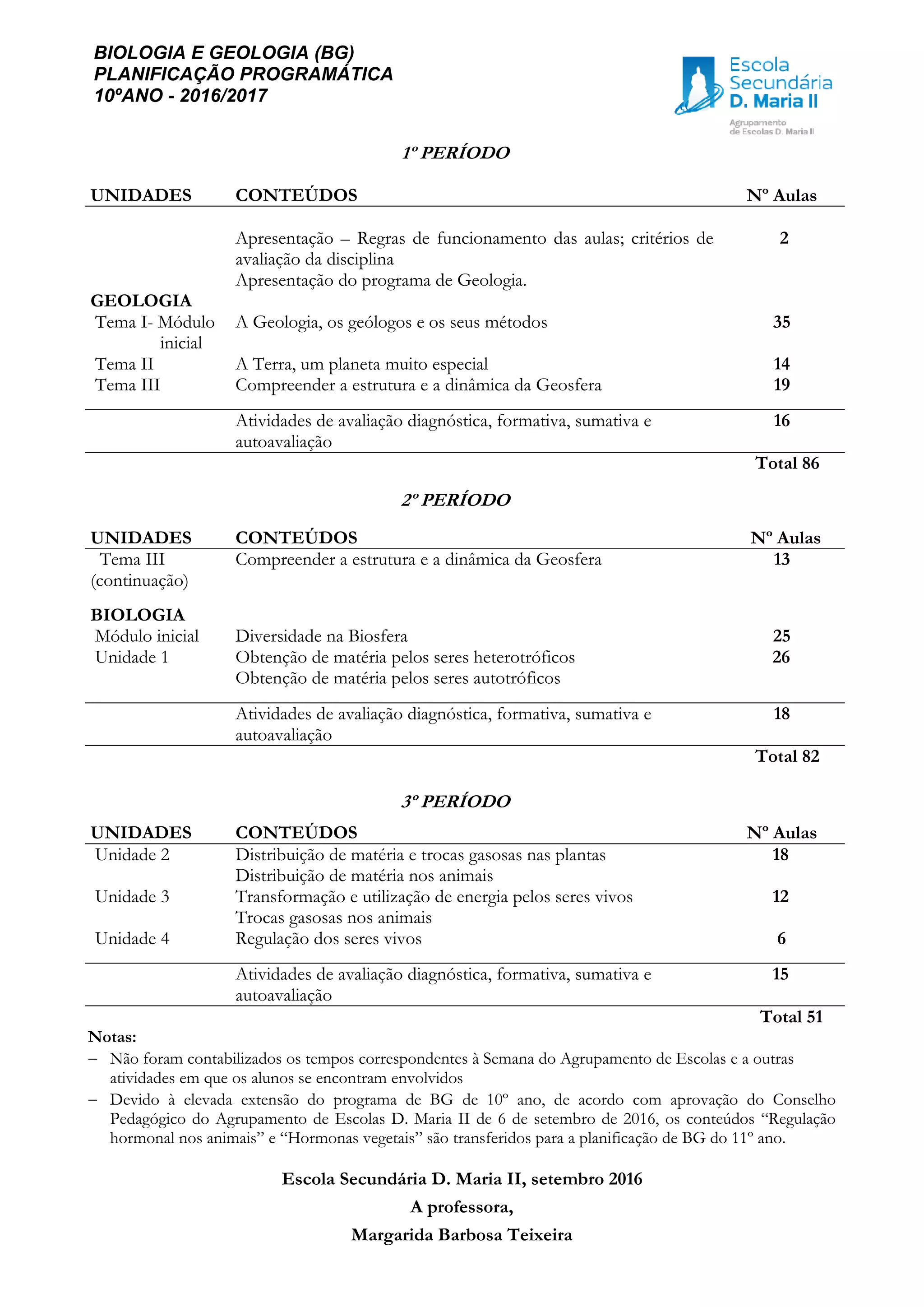 Este documento apresenta o plano de ensino de Biologia e Geologia para o 10o ano, dividido em três períodos. No primeiro período, os alunos estudarão Geologia, focando na estrutura e dinâmica da Terra. No segundo período, estudarão Biologia, cobrindo a diversidade de vida e obtenção de matéria. No terceiro período, aprenderão sobre distribuição de matéria, transformação de energia e regulação biológica.