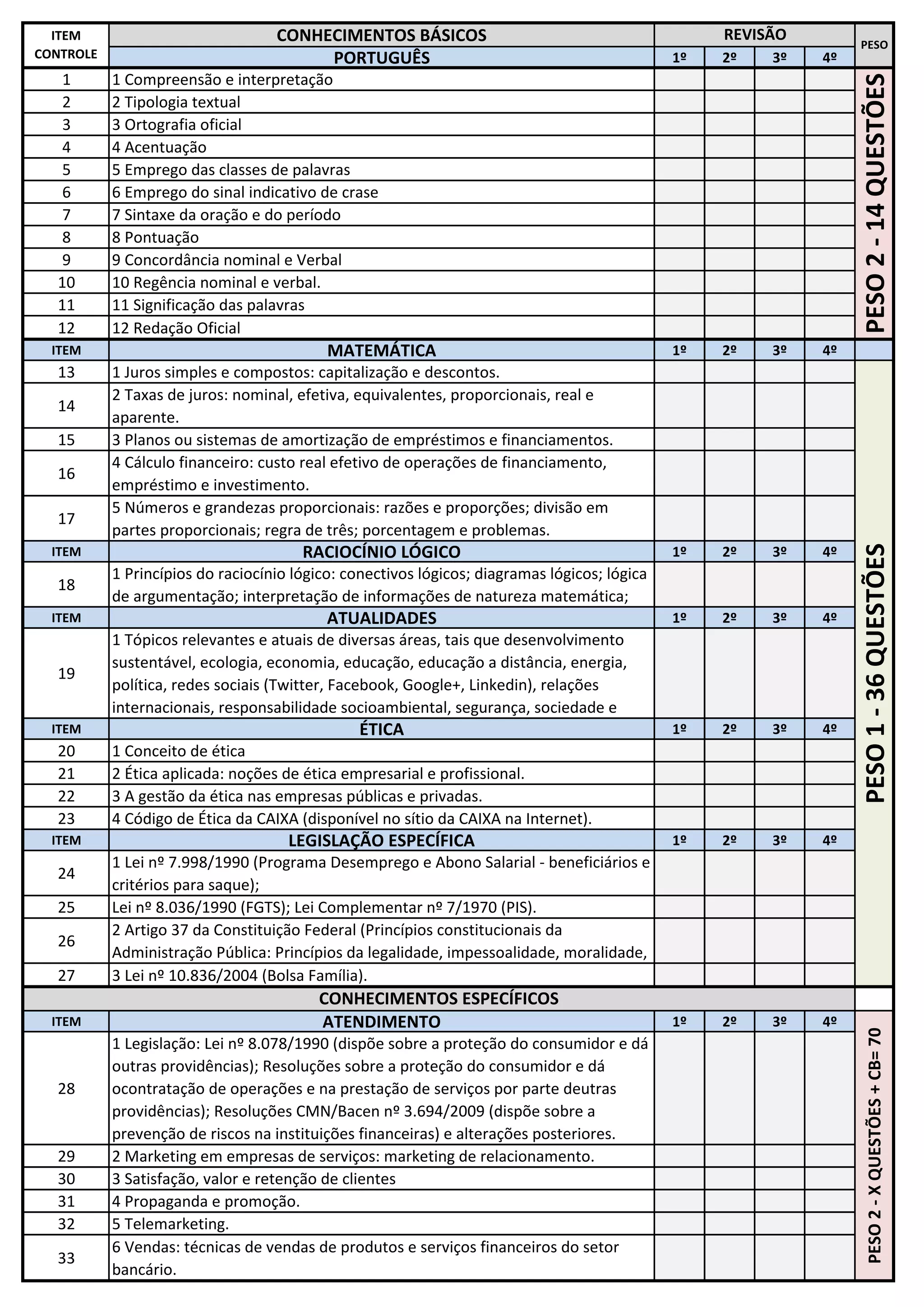 O documento apresenta uma lista de tópicos de conhecimentos necessários para o exame de seleção de uma instituição financeira. Estes incluem português, matemática, raciocínio lógico, atualidades, ética, legislação específica, atendimento, conhecimentos bancários e produtos bancários.