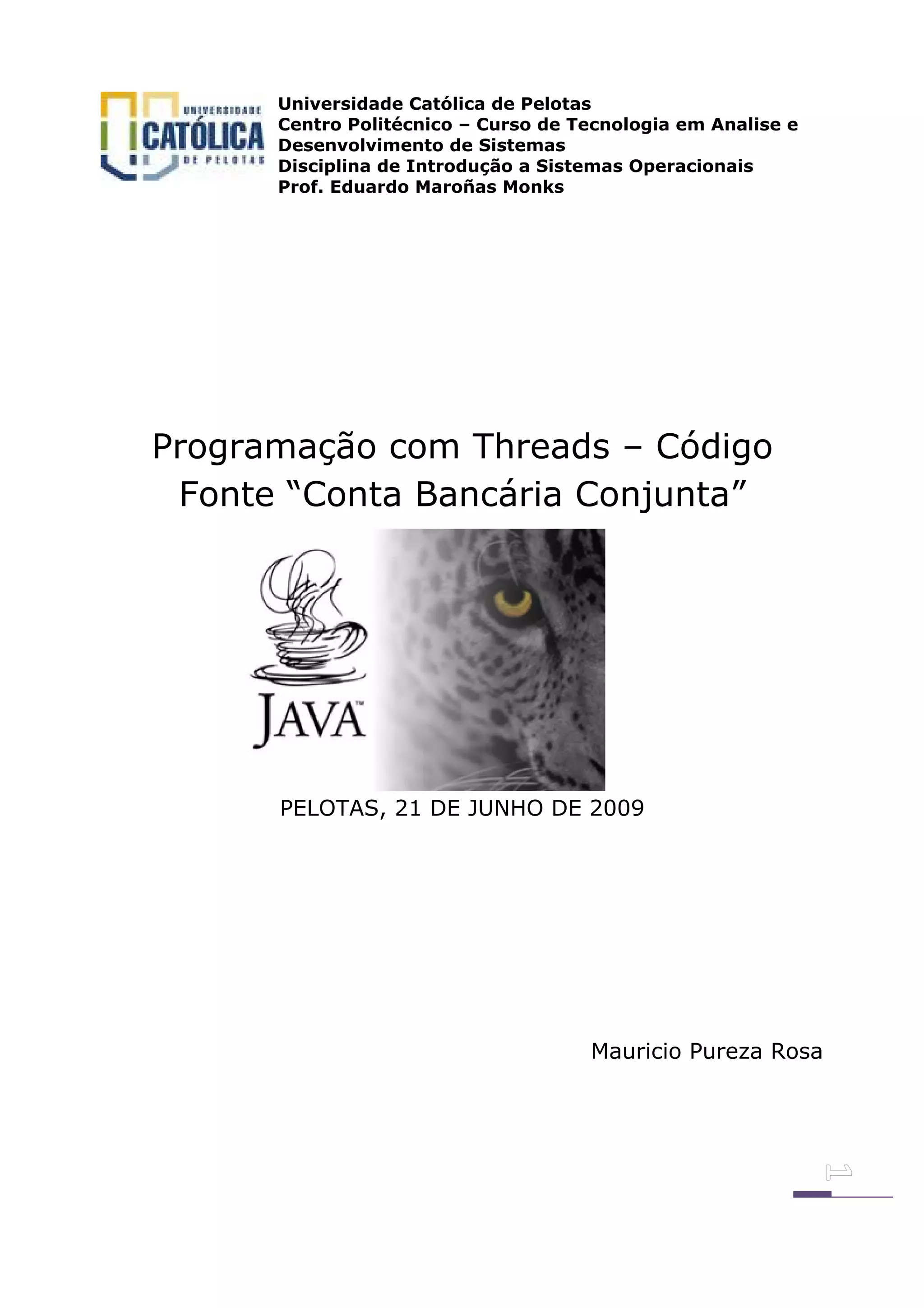 O documento apresenta um código fonte de um sistema de gerenciamento de uma conta bancária conjunta utilizando programação com threads. Ele inclui classes para o banco, clientes e a conta, demonstrando a simulação de saques com sincronização para evitar problemas de concorrência. O exemplo é parte de uma atividade acadêmica do curso de Tecnologia em Análise e Desenvolvimento de Sistemas da Universidade Católica de Pelotas.
