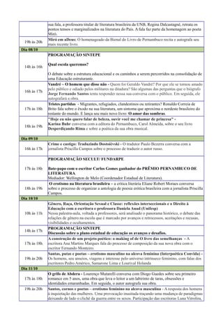 Este documento fornece a programação de eventos literários que ocorrerão entre os dias 02 a 12 de outubro no Espaço Paulo Freire e no Ascenso Café em Pernambuco. A programação inclui lançamentos de livros, mesas, debates e apresentações sobre diversos temas como literatura, educação, jornalismo e direitos trabalhistas.