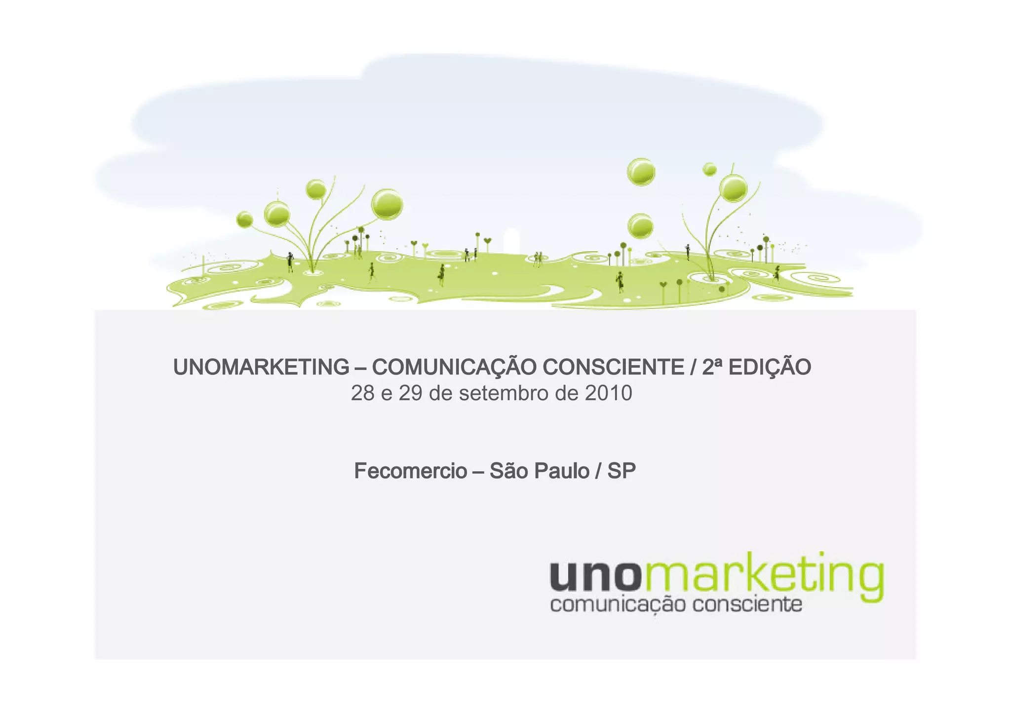O documento descreve o seminário "UnoMarketing - Comunicação Consciente" que ocorrerá nos dias 28 e 29 de setembro de 2010 na Fecomercio em São Paulo. O seminário abordará temas como desenvolvimento pessoal, consumo, mídia e responsabilidade social em 4 painéis ao longo dos dois dias.