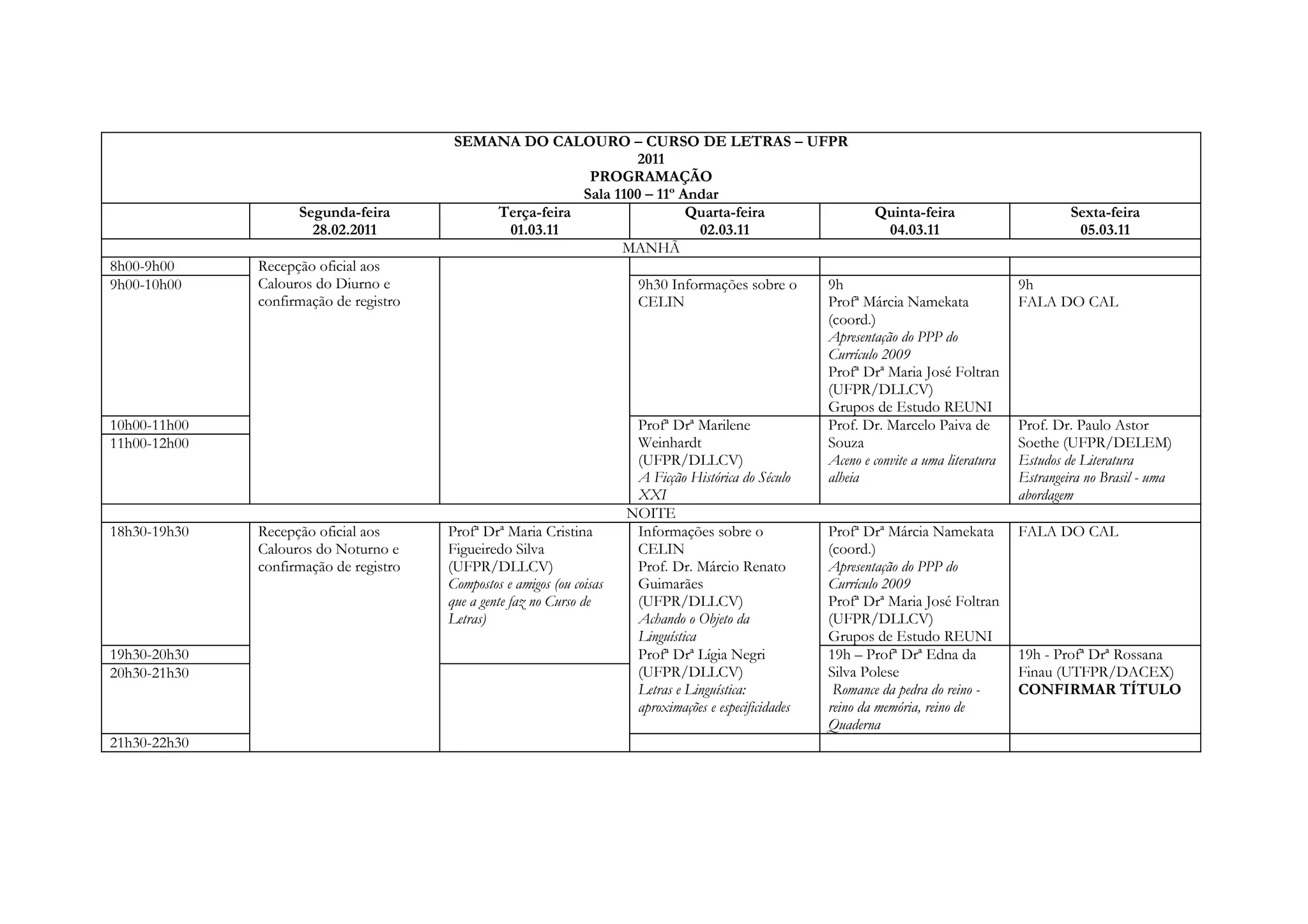 A programação da semana do calouro do curso de letras da UFPR inclui: