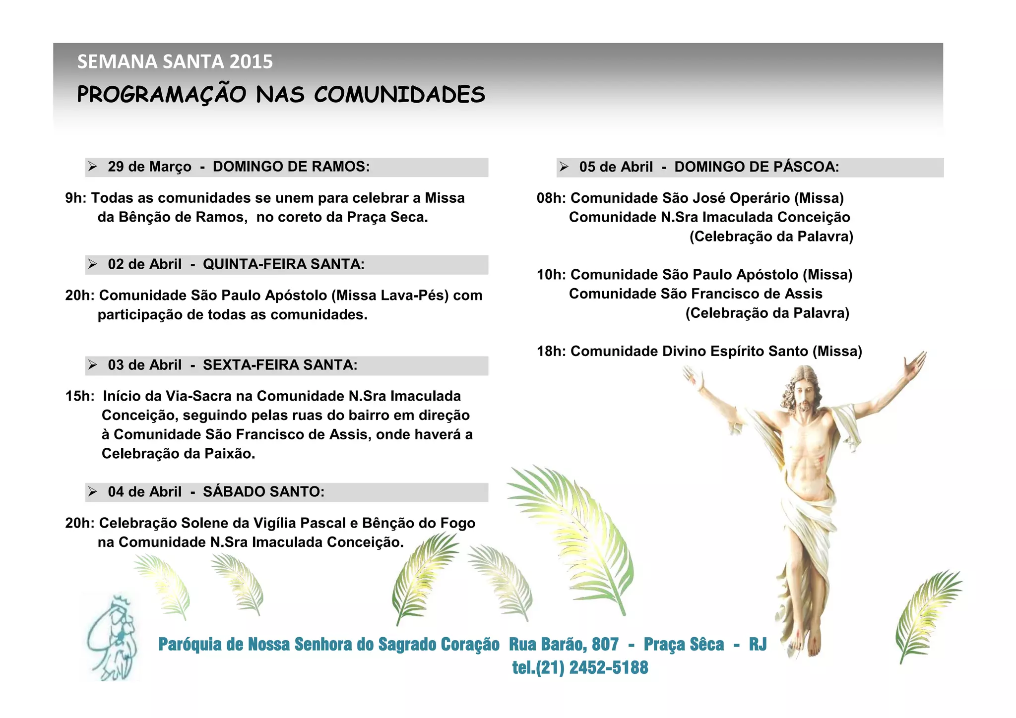 O documento lista o programa da Semana Santa de 2015 para várias comunidades, incluindo a Missa da Bênção de Ramos no domingo, a Missa Lava-Pés na quinta-feira, a Via-Sacra na sexta-feira e a Vigília Pascal no sábado, culminando com várias missas no domingo de Páscoa.