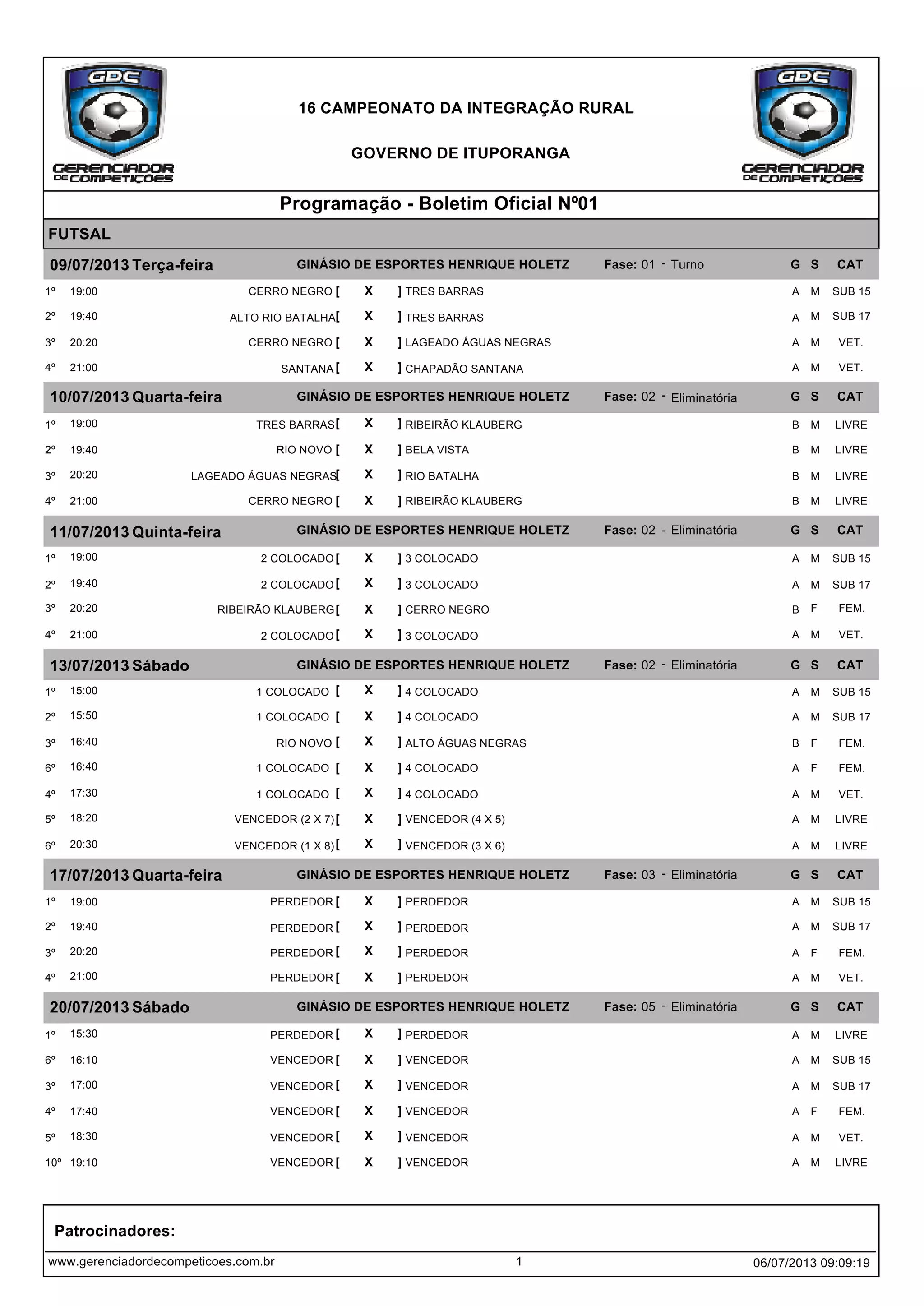 16 CAMPEONATO DAINTEGRAÇÃO RURAL GOVERNO DE ITUPORANGA Programação - Boletim Oficial Nº01 FUTSAL 09/07/2013 Terça-feira GINÁSIO DE ESPORTES HENRIQUE HOLETZ Fase: 01 - Turno G S CAT [ X ]19:00 TRES BARRASCERRO NEGRO1º SUB 15MA [ X ]19:40 TRES BARRASALTO RIO BATALHA2º SUB 17MA [ X ]20:20 LAGEADO ÁGUAS NEGRASCERRO NEGRO3º VET.MA [ X ]21:00 CHAPADÃO SANTANASANTANA4º VET.MA 10/07/2013 Quarta-feira GINÁSIO DE ESPORTES HENRIQUE HOLETZ Fase: 02 - Eliminatória G S CAT [ X ]19:00 RIBEIRÃO KLAUBERGTRES BARRAS1º LIVREMB [ X ]19:40 BELA VISTARIO NOVO2º LIVREMB [ X ]20:20 RIO BATALHALAGEADO ÁGUAS NEGRAS3º LIVREMB [ X ]21:00 RIBEIRÃO KLAUBERGCERRO NEGRO4º LIVREMB 11/07/2013 Quinta-feira GINÁSIO DE ESPORTES HENRIQUE HOLETZ Fase: 02 - Eliminatória G S CAT [ X ]19:00 3 COLOCADO2 COLOCADO1º SUB 15MA [ X ]19:40 3 COLOCADO2 COLOCADO2º SUB 17MA [ X ]20:20 CERRO NEGRORIBEIRÃO KLAUBERG3º FEM.FB [ X ]21:00 3 COLOCADO2 COLOCADO4º VET.MA 13/07/2013 Sábado GINÁSIO DE ESPORTES HENRIQUE HOLETZ Fase: 02 - Eliminatória G S CAT [ X ]15:00 4 COLOCADO1 COLOCADO1º SUB 15MA [ X ]15:50 4 COLOCADO1 COLOCADO2º SUB 17MA [ X ]16:40 ALTO ÁGUAS NEGRASRIO NOVO3º FEM.FB [ X ]16:40 4 COLOCADO1 COLOCADO6º FEM.FA [ X ]17:30 4 COLOCADO1 COLOCADO4º VET.MA [ X ]18:20 VENCEDOR (4 X 5)VENCEDOR (2 X 7)5º LIVREMA [ X ]20:30 VENCEDOR (3 X 6)VENCEDOR (1 X 8)6º LIVREMA 17/07/2013 Quarta-feira GINÁSIO DE ESPORTES HENRIQUE HOLETZ Fase: 03 - Eliminatória G S CAT [ X ]19:00 PERDEDORPERDEDOR1º SUB 15MA [ X ]19:40 PERDEDORPERDEDOR2º SUB 17MA [ X ]20:20 PERDEDORPERDEDOR3º FEM.FA [ X ]21:00 PERDEDORPERDEDOR4º VET.MA 20/07/2013 Sábado GINÁSIO DE ESPORTES HENRIQUE HOLETZ Fase: 05 - Eliminatória G S CAT [ X ]15:30 PERDEDORPERDEDOR1º LIVREMA [ X ]16:10 VENCEDORVENCEDOR6º SUB 15MA [ X ]17:00 VENCEDORVENCEDOR3º SUB 17MA [ X ]17:40 VENCEDORVENCEDOR4º FEM.FA [ X ]18:30 VENCEDORVENCEDOR5º VET.MA [ X ]19:10 VENCEDORVENCEDOR10º LIVREMA www.gerenciadordecompeticoes.com.br Patrocinadores: 1 06/07/2013 09:09:19