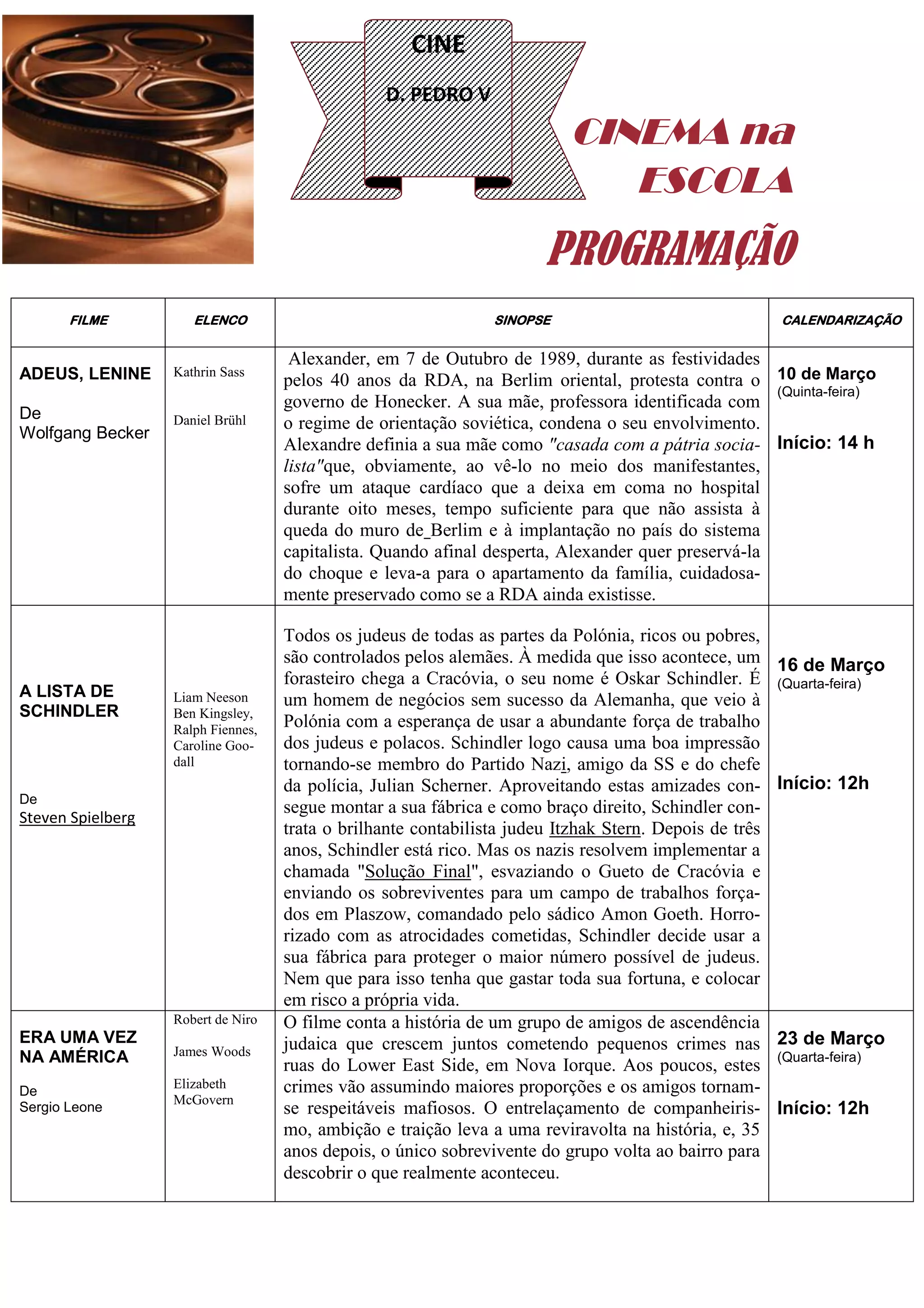 O documento apresenta a programação de três filmes que serão exibidos no cinema da escola, com seus respectivos elencos, sinopses e datas de exibição. Os filmes são: "Adeus, Lenine" sobre a queda do muro de Berlim, "A Lista de Schindler" sobre o empresário alemão que salvou judeus durante o Holocausto e "Era Uma Vez na América" sobre amigos judeus que se tornam mafiosos em Nova York.