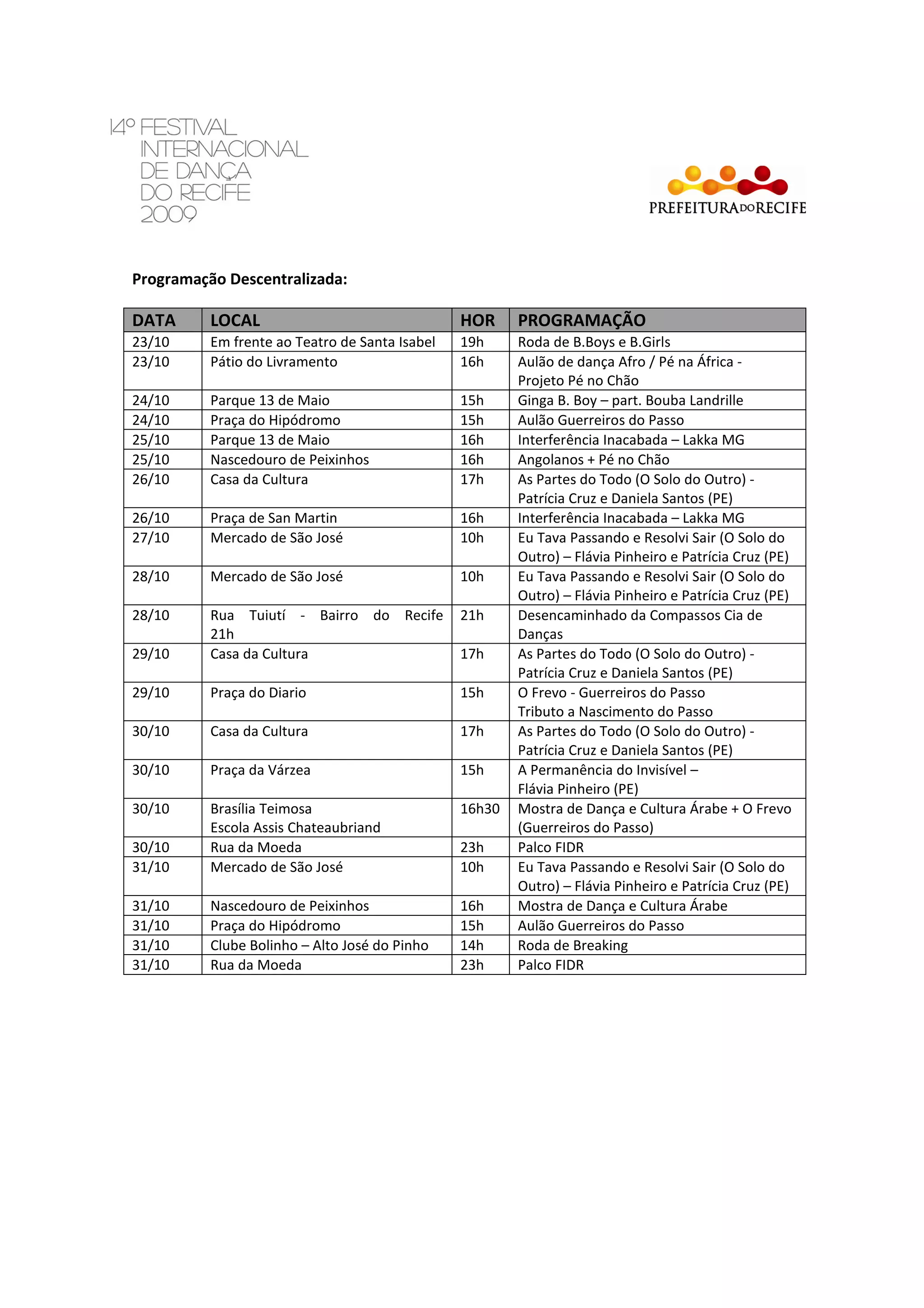 Este documento lista as programações culturais descentralizadas que ocorrerão em vários locais de Recife entre os dias 23 e 31 de outubro, incluindo apresentações de dança, rodas de breakdance, aulões e shows com artistas locais e de Pernambuco.