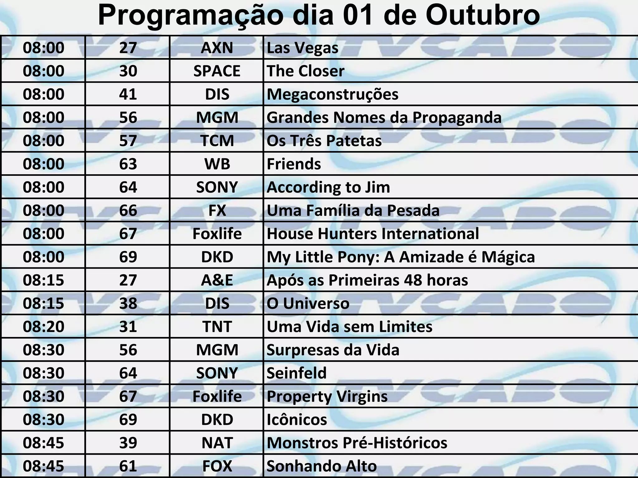 A programação de canais de TV do dia 01 de Outubro mostra diversos programas sendo exibidos entre 08:00 e 23:00 nos canais A&E, AXN, SPACE, DIS, NAT, TCM, WB, SONY, FX, Foxlife e DKD, incluindo séries, filmes e programas de variedades sobre crimes, culinária, decoração e animação.