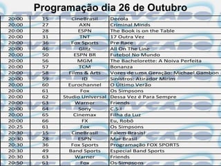 Este documento fornece a programação de canais de TV para o dia 26 de Outubro, listando os programas e horários em cada canal. Os principais canais de TV exibirão filmes, séries e programas de esporte entre 19h e 23h.